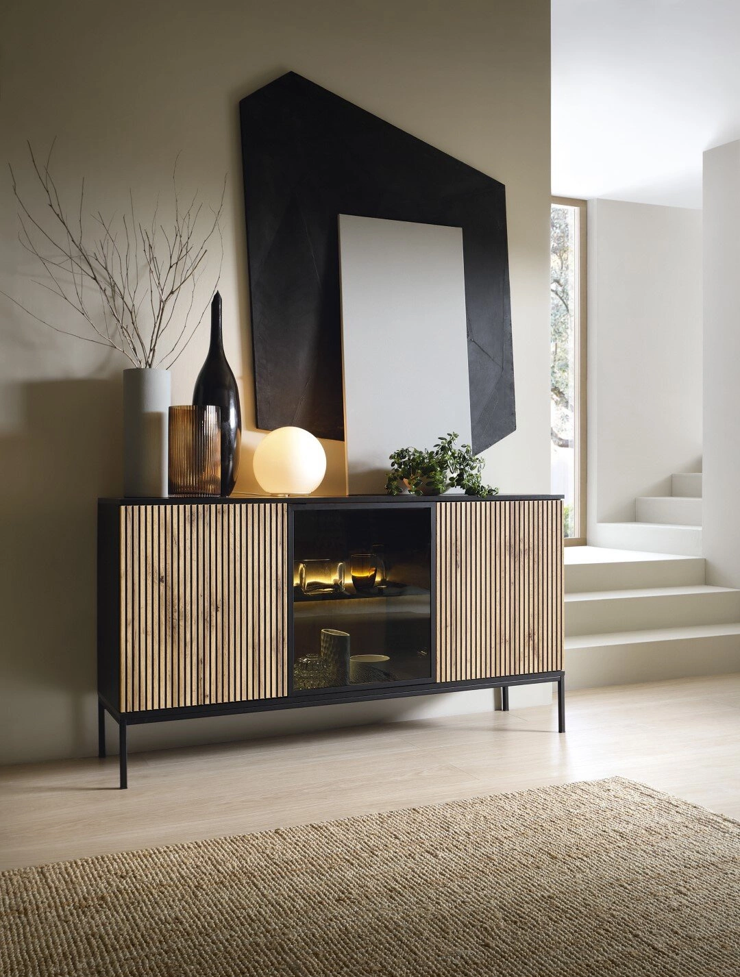 Szerokość 154 cm oraz system trzech szafek oferują miejsce na wszystko, co chcesz mieć pod ręką w salonie, sypialni czy przedpokoju. Jedna z szafek z przeszklonym frontem pozwoli Ci efektownie wyeksponować dekoracje, książki lub kolekcję ceramiki. Wygodny mechanizm push to open umożliwia szybkie i bezproblemowe otwieranie szafek — bez uchwytów, bez zbędnych detali, z zachowaniem minimalistycznego wyglądu. Cztery solidne, metalowe nóżki nie tylko ułatwiają sprzątanie pod meblem, ale także dodają mu lekkości.