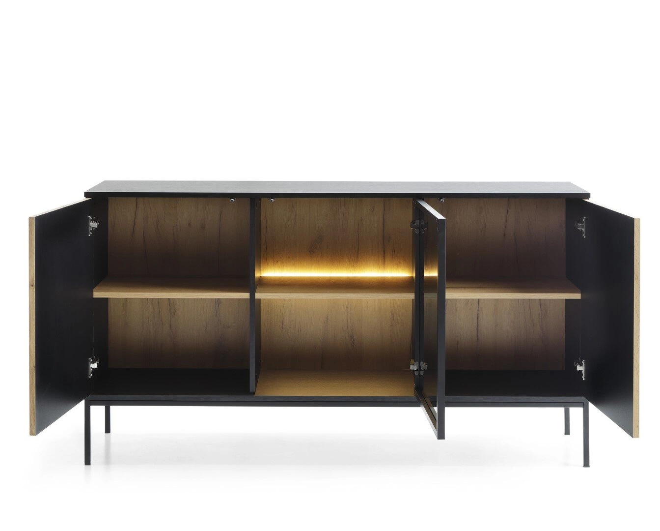 Komoda Novel 154 cm marki Intesi to połączenie nowoczesnego designu, funkcjonalności i elegancji. Została wykonana w modnym wybarwieniu dąb wotan z czarnymi akcentami, posiada efektowne oświetlenie LED oraz stoi na stabilnych, czarnych nóżkach. Oferuje szeroką przestrzeń do przechowywania dzięki trzem pojemnym szafkom i półkom, a frezowane pionowo fronty podkreślają jej industrialny styl. Idealnie sprawdzi się jako komoda do salonu, sypialni lub przedpokoju, wprowadzając do wnętrza unikalny, loftowy klimat.