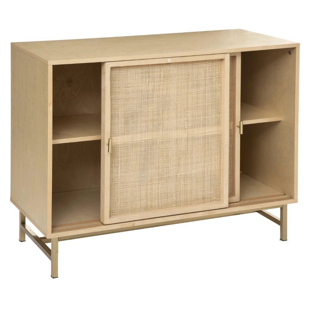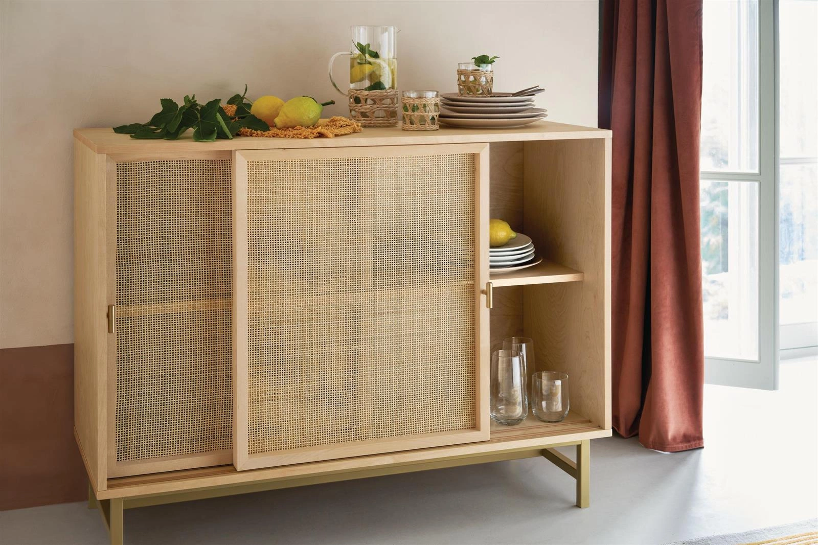 Komoda z rattanowymi rozsuwanymi frontami to mebel wykonany w stylu Boho. Charakteryzuje się on wykonaniem z naturalnych materiałów i bliskim kontakcie z naturą. Plecionka z rattanu umieszczona została w drewnianych- brzozowych frontach komody, dodając meblowi wizualnej lekkości. Zaletą Rayo są 2 szerokie półki z przesuwanymi drzwiczkami. Mebel sprawdzi się w salonie, przechowa twoją zastawę stołową lub inne przedmioty. Nogi komody oraz uchwyty zostały wykonane z metalu, pomalowanego na złoty kolor. Stanowią one subtelną dekorację, która nie zakłóca klasycznej i minimalistycznej stylistyki mebla. Korpus komody to niezwykle wytrzymała płyta meblowa, w okleinie imitującej drewno. Rayo o naturalnych barwach optycznie ociepli twoją przestrzeń. Ten urokliwy produkt z pewnością zawróci w głowie niejednej osobie. Jeśli chcesz w jednolity sposób urządzić swoje mieszkanie postaw na inne meble z tej samej serii!