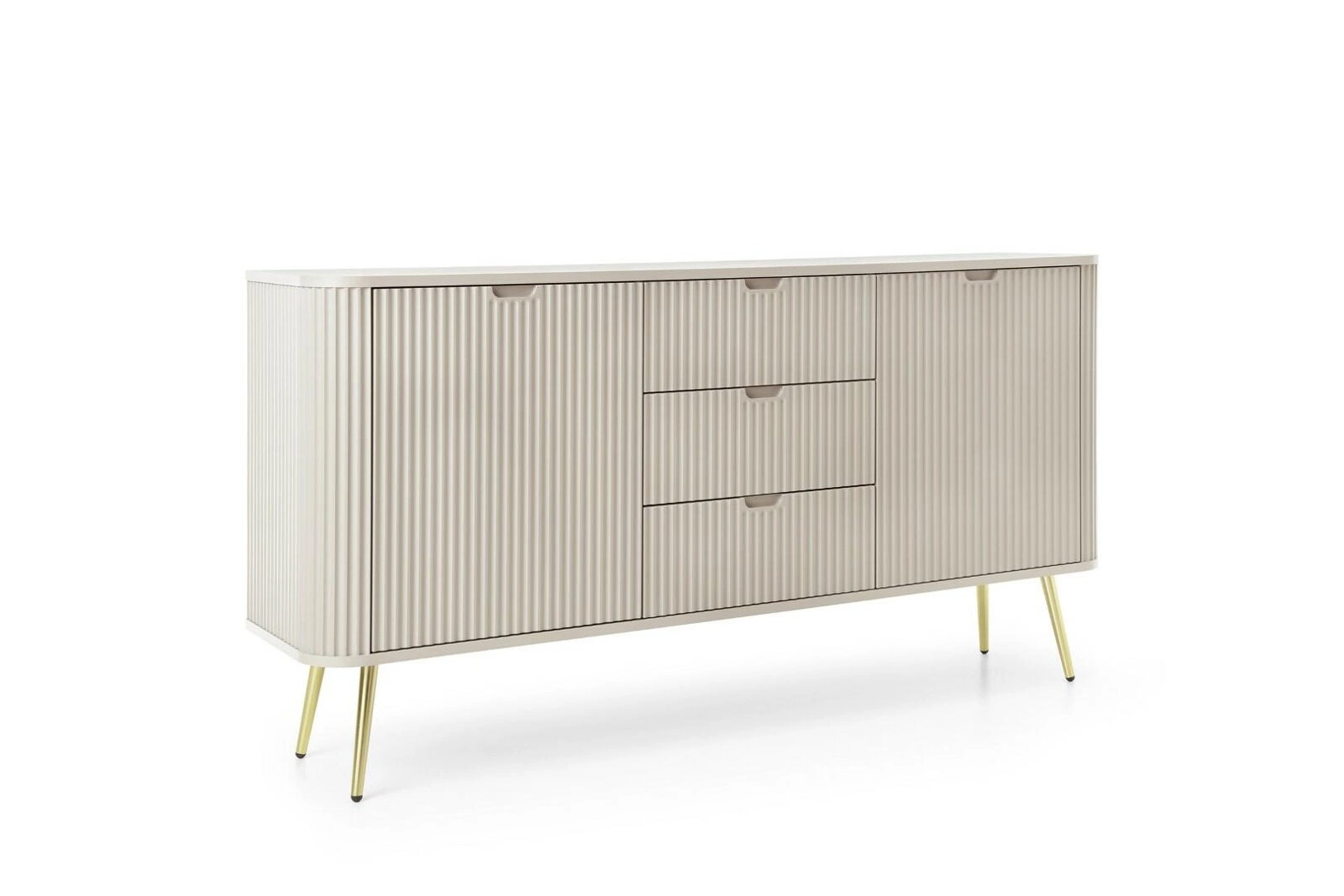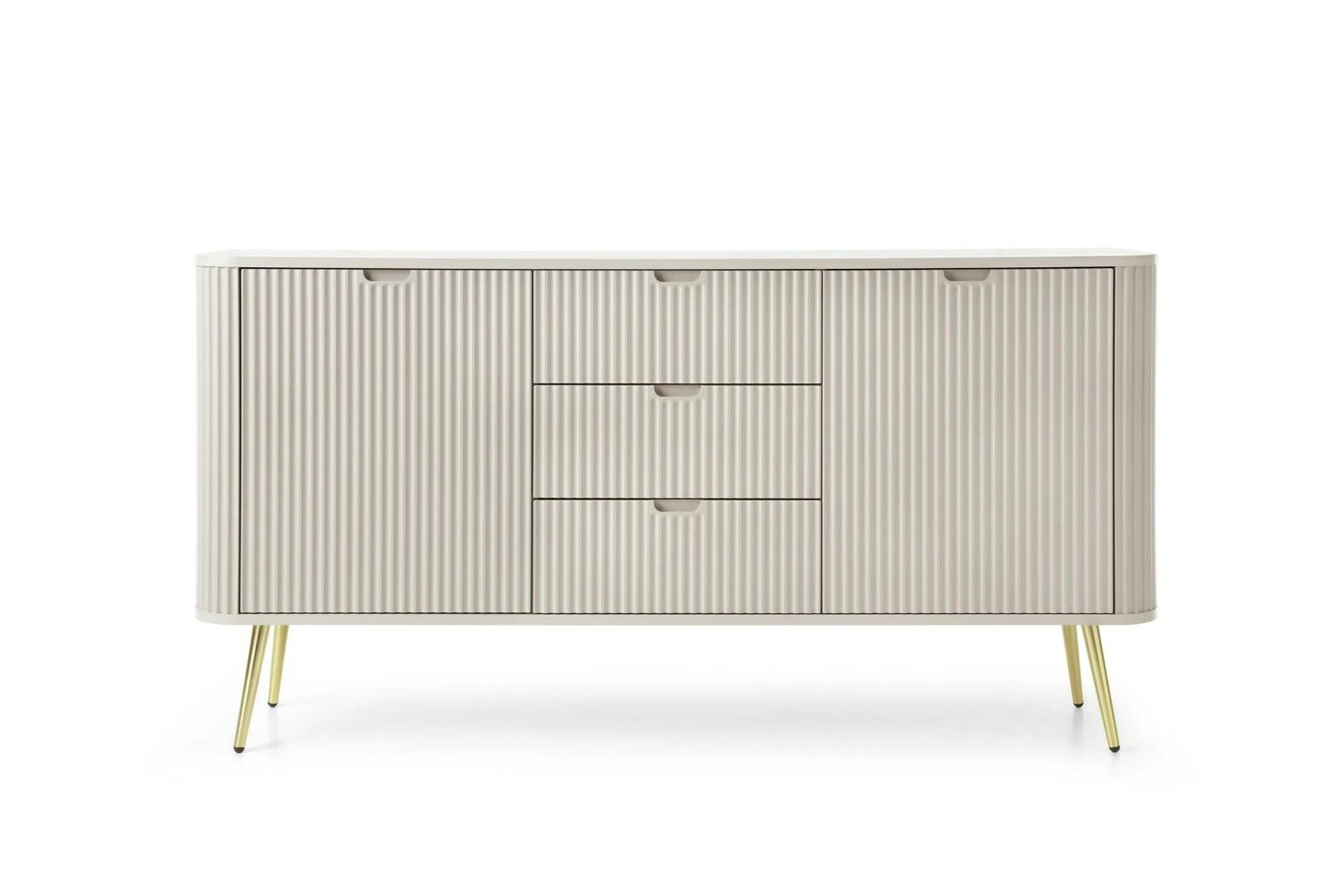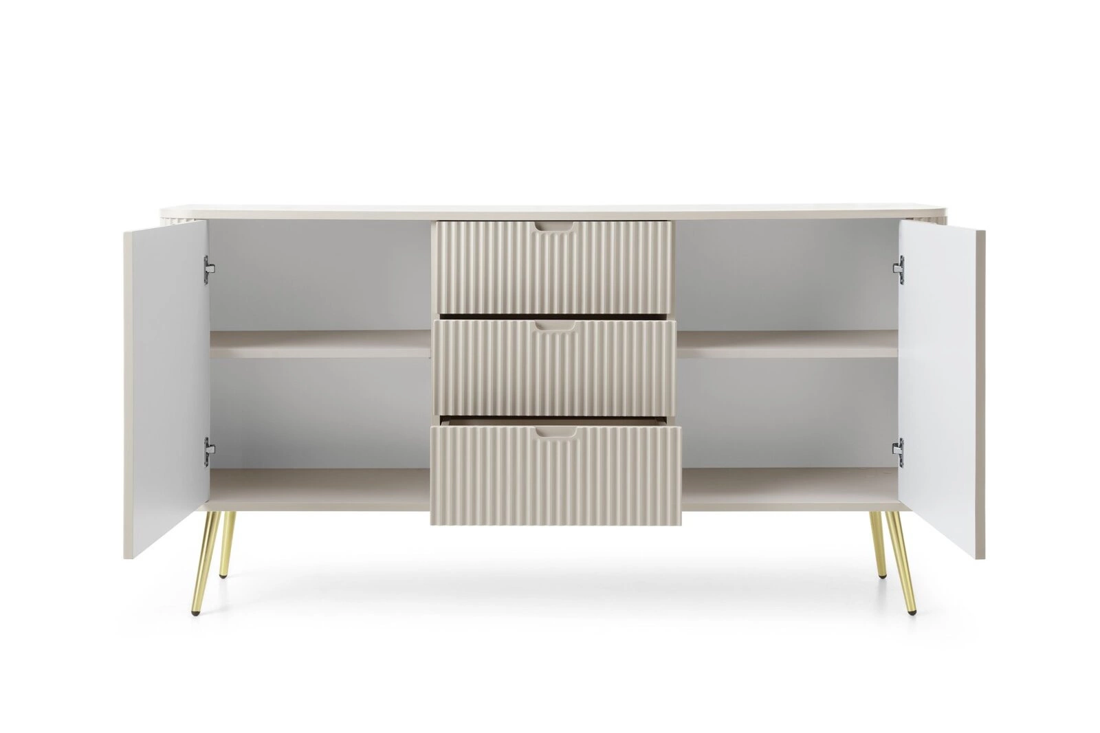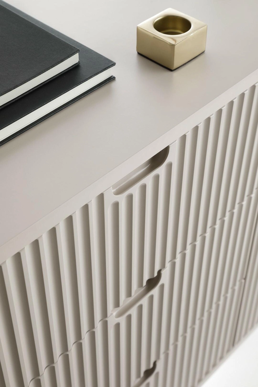 - Frezowane detale na korpusie i frontach oraz uchwyty dodają komodzie elegancji