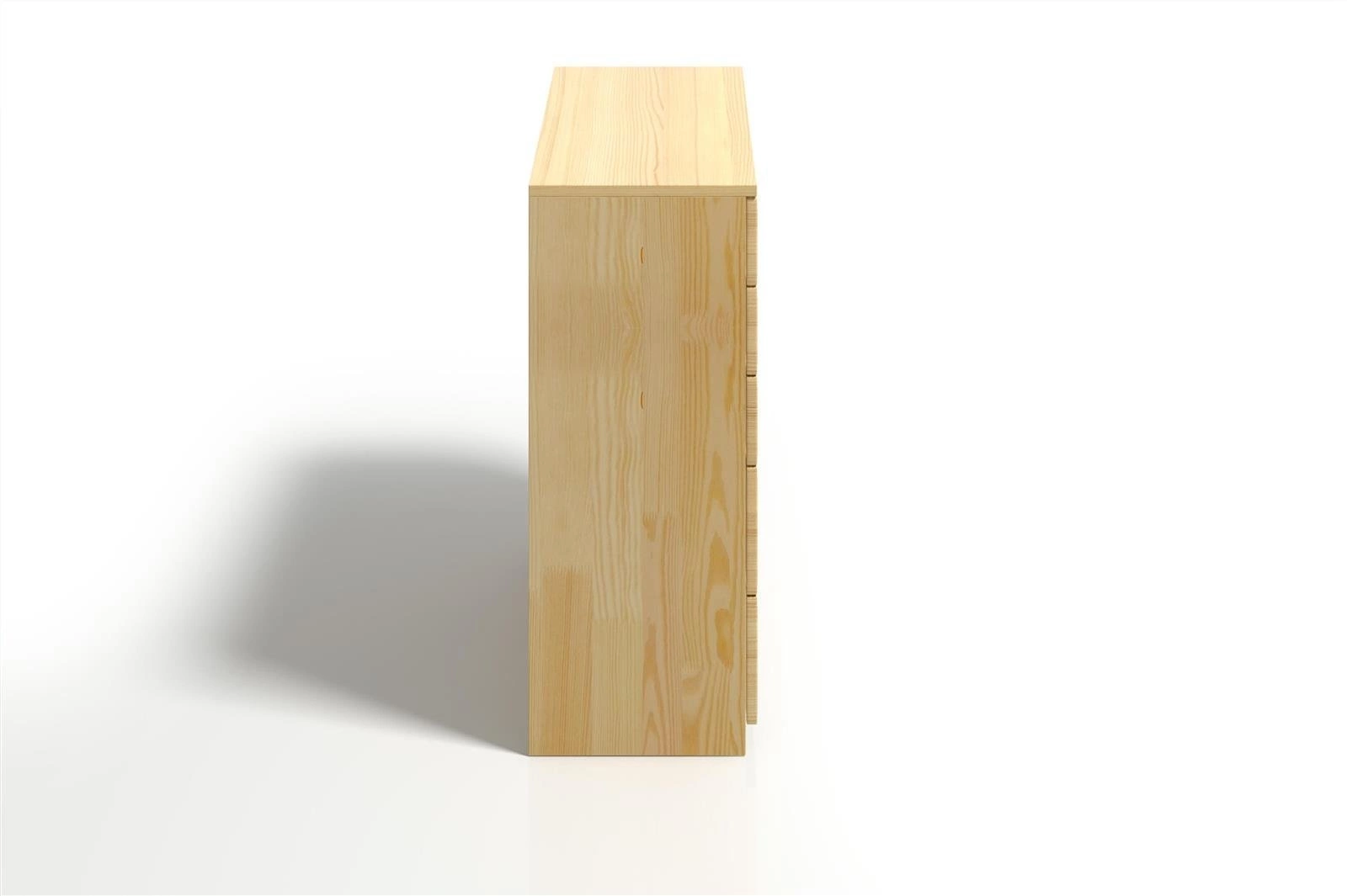 To średniej wielkości komoda w minimalistycznym stylu nawiązującym do skandynawskiego wzornictwa. Wykonana z wysokiej jakości drewna sosnowego polskiego pochodzenia, które dzięki specjalnej technologii łączenia na "mikrowczepy" jest się meblem ponadprzeciętnej wytrzymałości. O wysokiej jakości tej komody decydują także detale - prowadnice z systemem cichego domyku i hamulcem, dzięki którym szuflady zamykają się bezgłośnie i miękko.