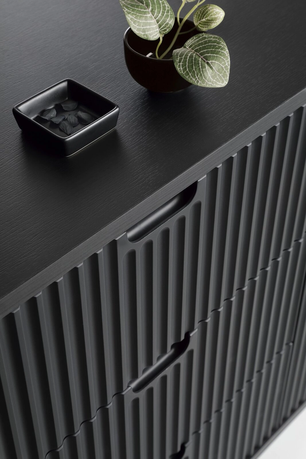 Komoda Seda została wyposażona w trzy obszerne szuflady oraz dwie pojemne szafki, co umożliwia przechowywanie różnorodnych przedmiotów, od ubrań po akcesoria czy dokumenty. Fronty mebla wykonane z frezowanego płaszczowanego MDF o grubości 18 mm prezentują się niezwykle stylowo i nowocześnie, dodając wnętrzu wyjątkowego charakteru.