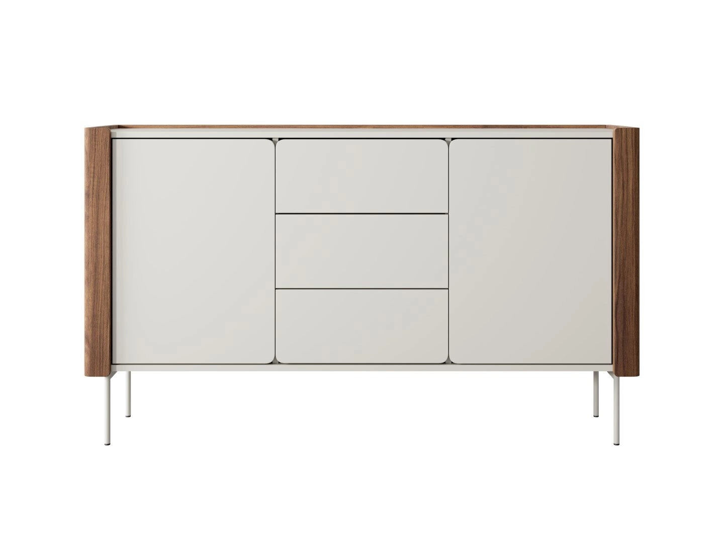Komoda szeroka Taberg marki Intesi to połączenie minimalistycznego designu, eleganckiego beżowego wykończenia i funkcjonalności na najwyższym poziomie. Szerokość 154 cm daje przestrzeń do przechowywania, a wysokie, metalowe nóżki nie tylko dodają lekkości formie, ale także ułatwiają utrzymanie porządku pod meblem. Cichy domyk, dwie pojemne szafki i półki sprawiają, że ta nowoczesna komoda świetnie odnajdzie się w salonie, jadalni czy garderobie.