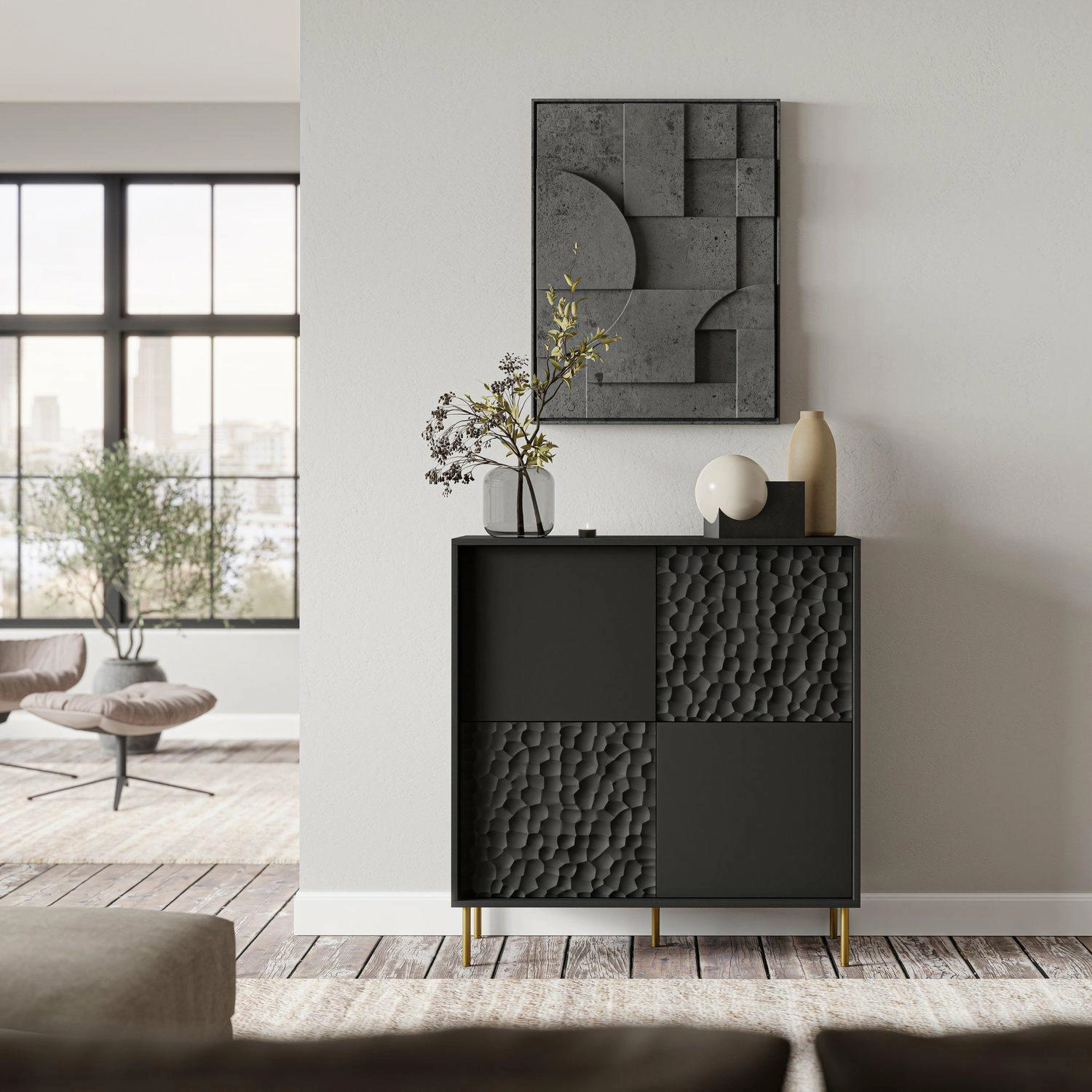 Dzięki czterem drzwiczkom, masz łatwy dostęp do przechowywanych przedmiotów, a dzięki kwadratowej formie komody, mebel będzie pasował do różnych wnętrz Twojego domu.Podsumowując, komoda z kolekcji Afir to nie tylko praktyczne rozwiązanie do przechowywania, ale także element dekoracyjny, który odświeży i ulepszy wygląd Twojego wnętrza. Jej elegancki wygląd, duża pojemność i uniwersalny czarny kolor sprawiają, że jest to doskonały wybór dla wszystkich, którzy szukają mebla, który nie tylko spełni swoje funkcje, ale także będzie ozdobą każdego pomieszczenia.
