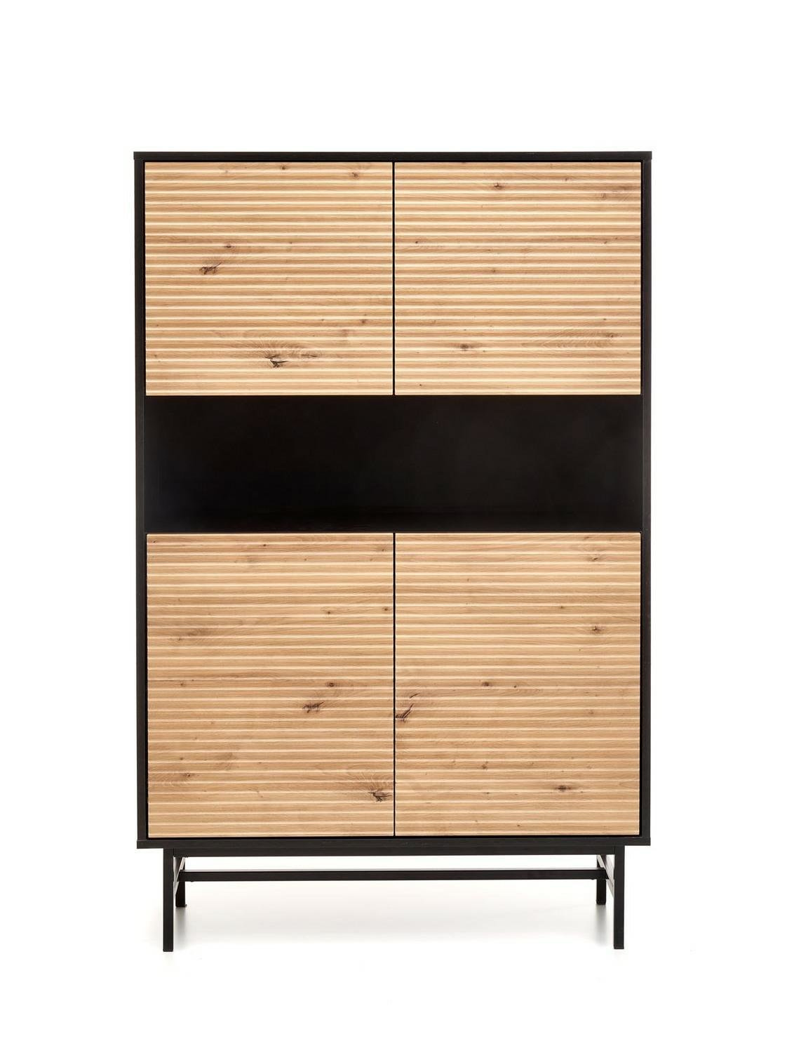 Komoda wysoka Nihala marki Intesi to połączenie ponadczasowego stylu loftowego z praktycznością codziennego użytkowania. Wykonana w efektownym zestawieniu dębu artisan i czerni, przyciąga uwagę frezowanymi frontami oraz solidną, metalową podstawą na czterech nogach. Dzięki wysokości aż 156 cm i szerokości 100 cm oferuje aż 9 pojemnych półek i 4 zamykane szafki, które pomogą zorganizować przestrzeń w salonie, sypialni czy przedpokoju.