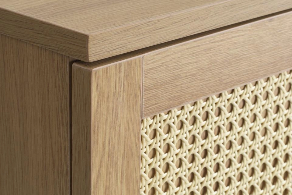 Fronty komody zdobią dekoracyjne wstawki z rattanu, które w połączeniu z wykończeniem w kolorze naturalnego dębu tworzą wyrazisty, boho klimat. Taki duet ociepla przestrzeń i świetnie komponuje się zarówno z jasnymi, jak i ciemnymi ścianami. To komoda nowoczesna, ale z wyraźnym akcentem retro, dzięki czemu łatwo dopasujesz ją do wnętrz urządzonych w stylu boho, natural, a nawet minimalistycznym.
