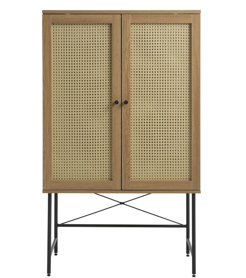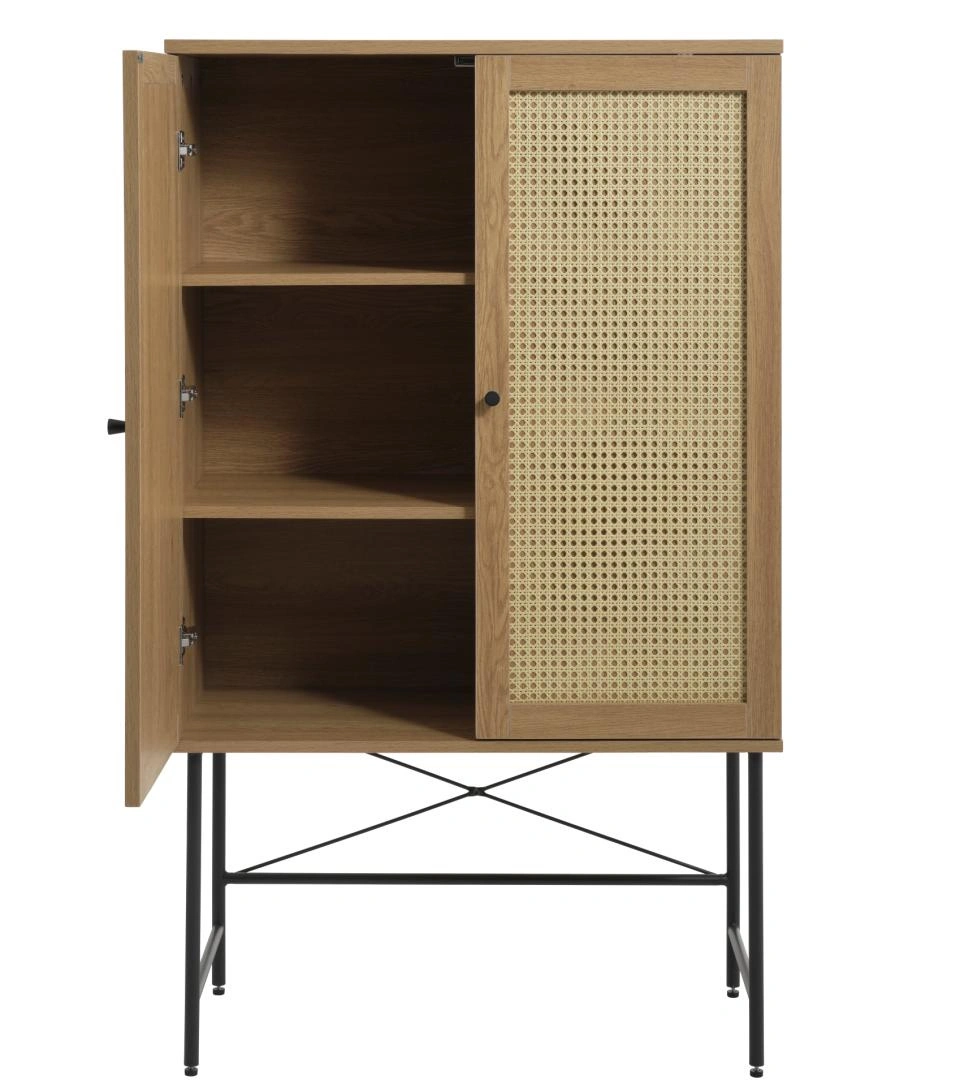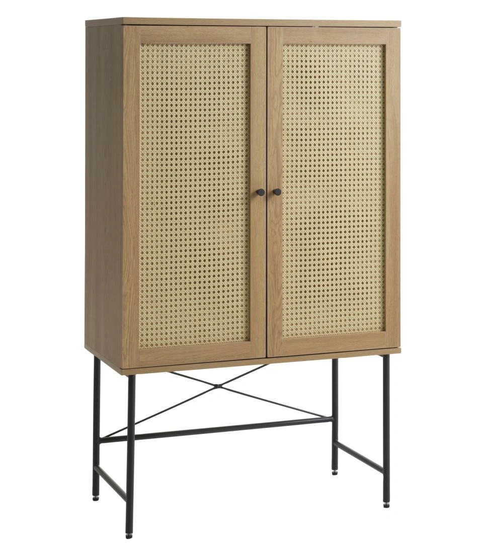 Komoda wysoka Pensacola marki UNIQUE to nowoczesna komoda z rattanowymi frontami w kolorze naturalnego dębu, osadzona na czarnych, metalowych nogach. Wysokość 135 cm i szerokość 80 cm sprawiają, że to idealna komoda do salonu, sypialni czy przedpokoju, oferująca 2 pojemne szafki z półkami na uporządkowane przechowywanie.