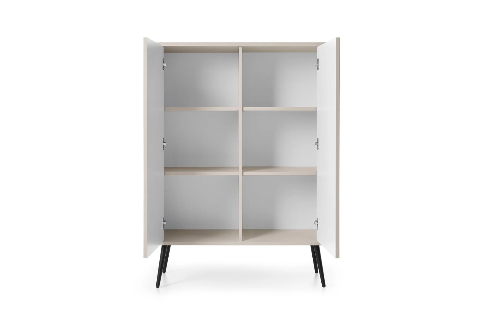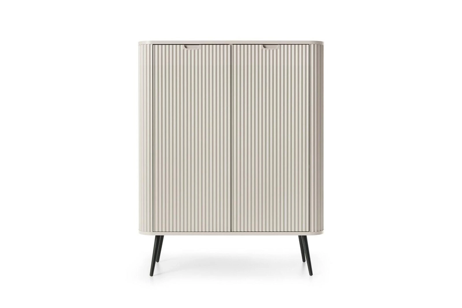 - Estetyczny wygląd komody dzięki frezowanym detalom, metalowym uchwytom i nóżkom nadaje wnętrzu elegancki i nowoczesny charakter