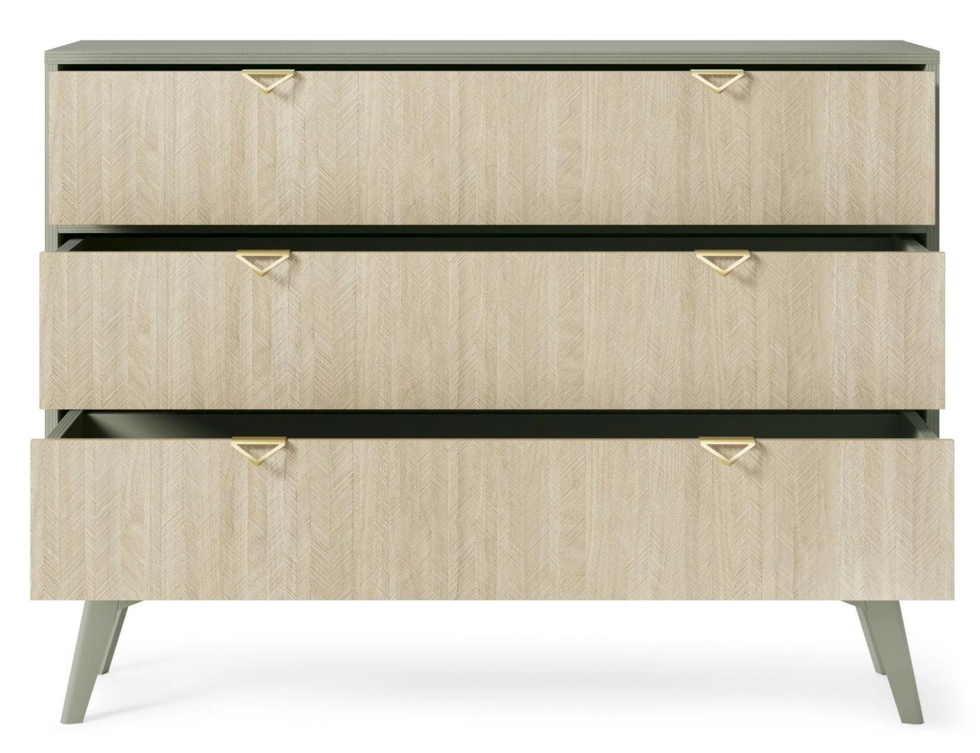 Komoda z szufladami Sage 106 cm w jodełkę szałwiowa glamour na nóżkach do salonu Intesi