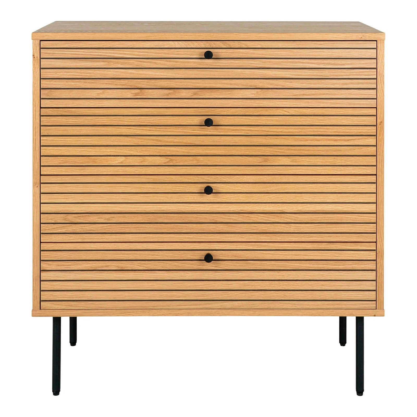 Komoda Kyoto marki House Nordic to kompaktowa komoda skandynawska z czterema szufladami o szerokości 80 cm, wykończona naturalnym fornirem dębowym i osadzona na smukłych czarnych nogach ze stali. Łączy elegancki, ryflowany front z praktycznym przechowywaniem, idealnie sprawdzając się w salonie, sypialni, przedpokoju czy pokoju młodzieżowym.