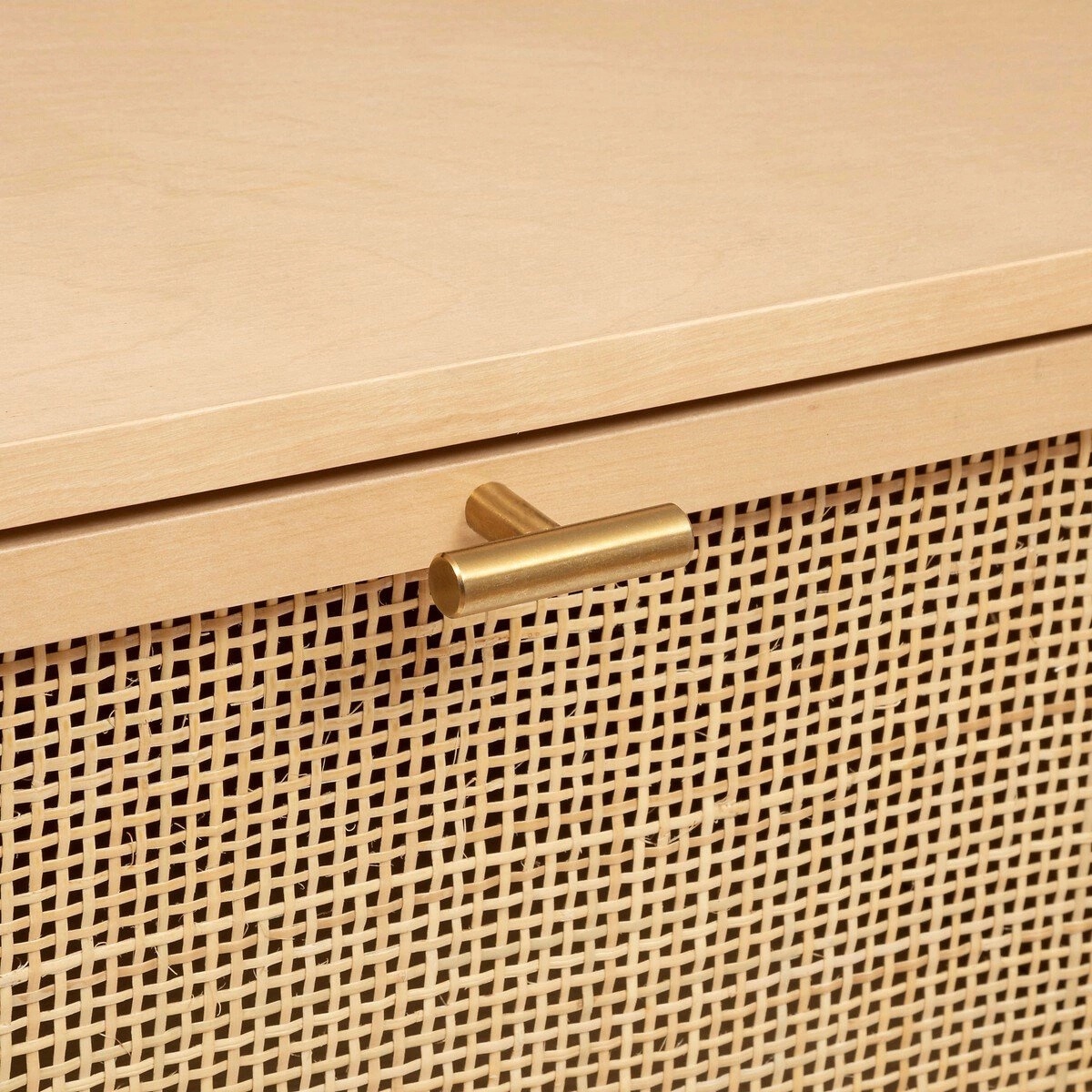 Wąska komoda Rayo- Naturalny akcent do Twojego wnętrza Wąska komoda Rayo to zapierający dech w piersiach mebel, który przenosi naturalny urok do wnętrza Twojego domu. Jej wyjątkowy design oparty na rattanowych frontach sprawia, że komoda emanuje delikatnością i estetyką natury. Fronty komody wykonane z rattanowej plecionki harmonijnie łączą się z drewnianymi, brzozowymi panelami, tworząc unikalny kontrast tekstur. To połączenie dodaje meblowi subtelnej elegancji, a zarazem przypomina o pięknie natury, które możemy mieć w zasięgu ręki. Wytrzymałość i funkcjonalność są priorytetem tej komody. Jej korpus zbudowany z solidnej płyty meblowej, pokrytej okleiną imitującą drewno, gwarantuje trwałość na wiele lat. Natomiast metalowe nóżki oraz uchwyty komody, utrzymane w złotym odcieniu, stanowią wspaniały akcent, który dodaje luksusu i wyjątkowości. Te detale nadają komodzie Rayo niepowtarzalnego charakteru, przyciągając wzrok i podkreślając jej wysoką jakość wykonania. Co więcej, cztery pojemne szuflady pozwalają na przechowywanie rozmaitych przedmiotów, pomagając utrzymać porządek w pomieszczeniu. Komoda Rayo to nie tylko mebel, ale również element dekoracyjny, który doskonale wkomponuje się w różnorodne wnętrza. Pasuje do salonu jako funkcjonalne centrum przechowywania, do przedpokoju jako elegancka witryna na drobiazgi, a także do sypialni, dodając przytulności i naturalnego uroku. Co warto wiedzieć przed zakupem? Wąska komoda Rayo Rattan przynosi naturalną harmonię do Twojego wnętrza. Rattanowe fronty tworzą subtelny i estetyczny design. Złote metalowe akcenty dodają luksusu i wyjątkowości. Wytrzymały korpus zapewnia długotrwałe użytkowanie. Uniwersalne zastosowanie komody sprawia, że pasuje do wielu pomieszczeń.