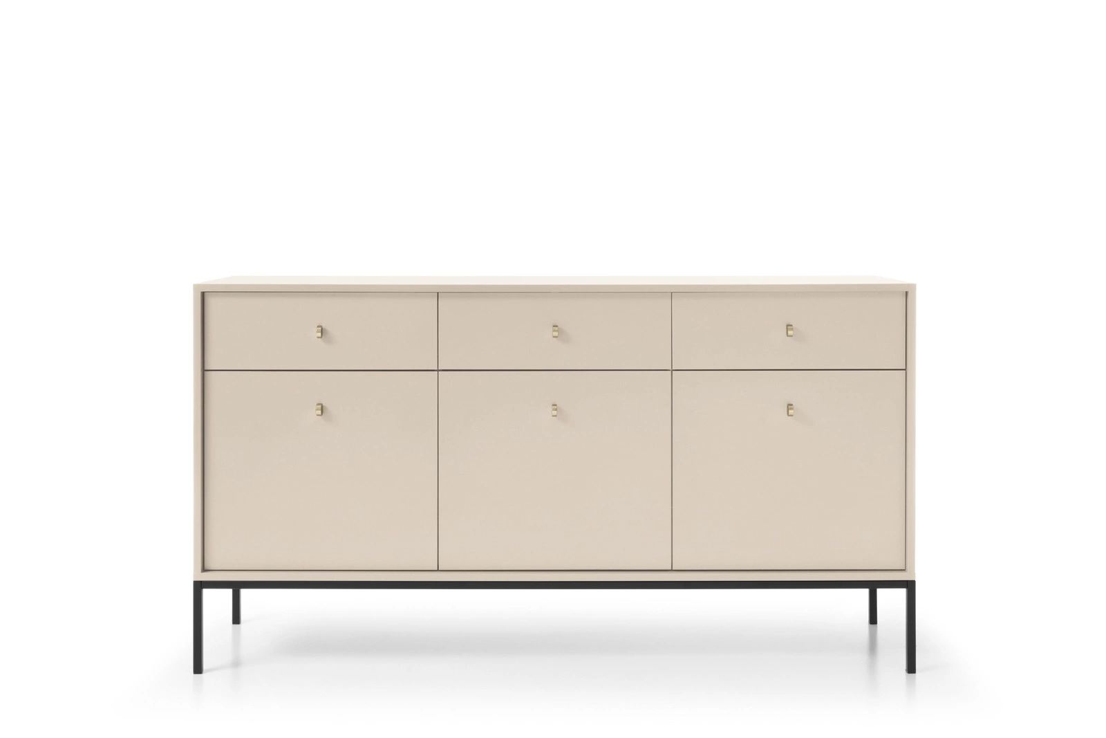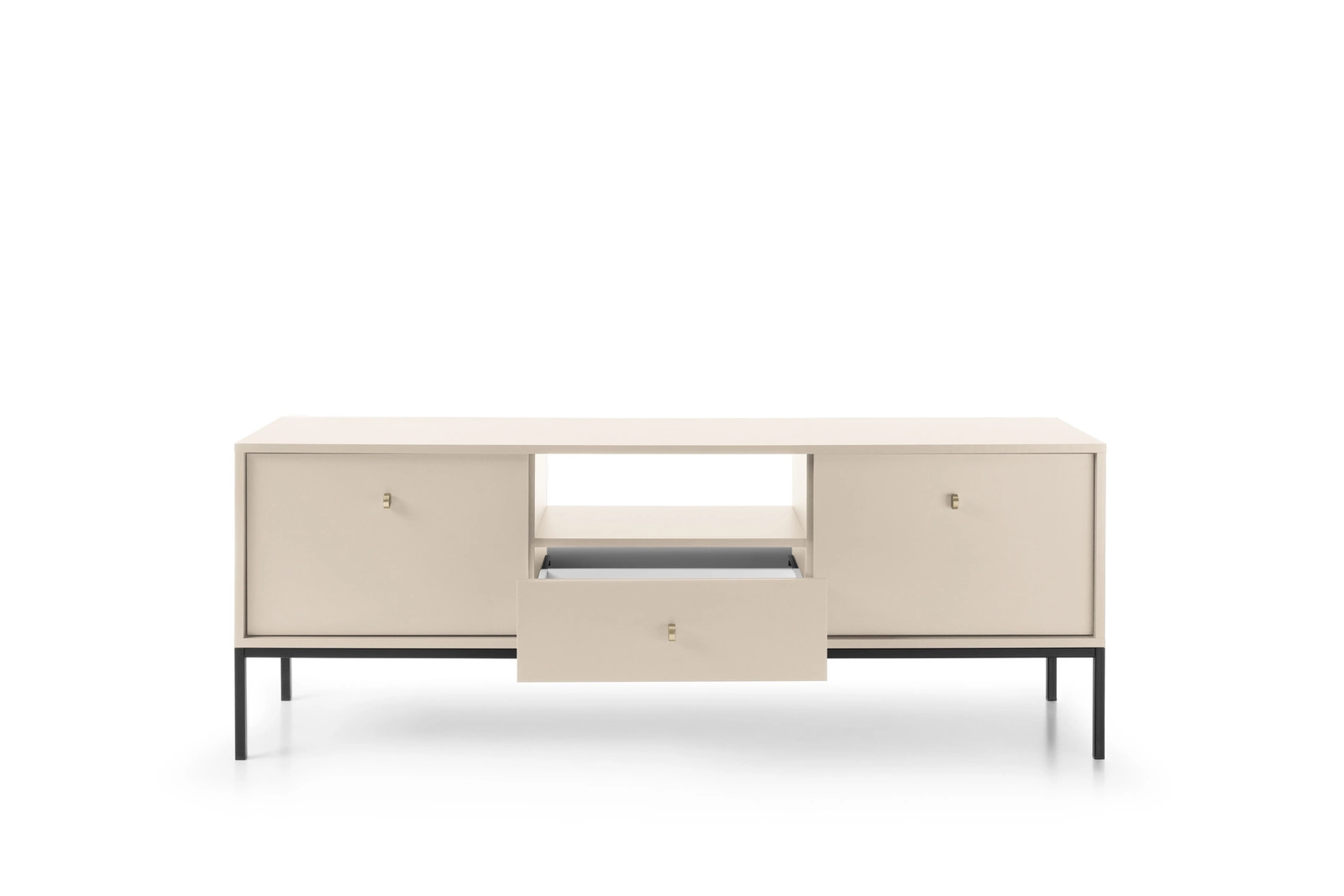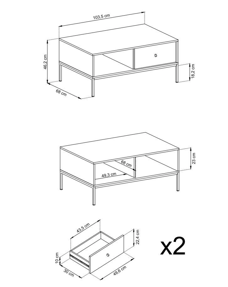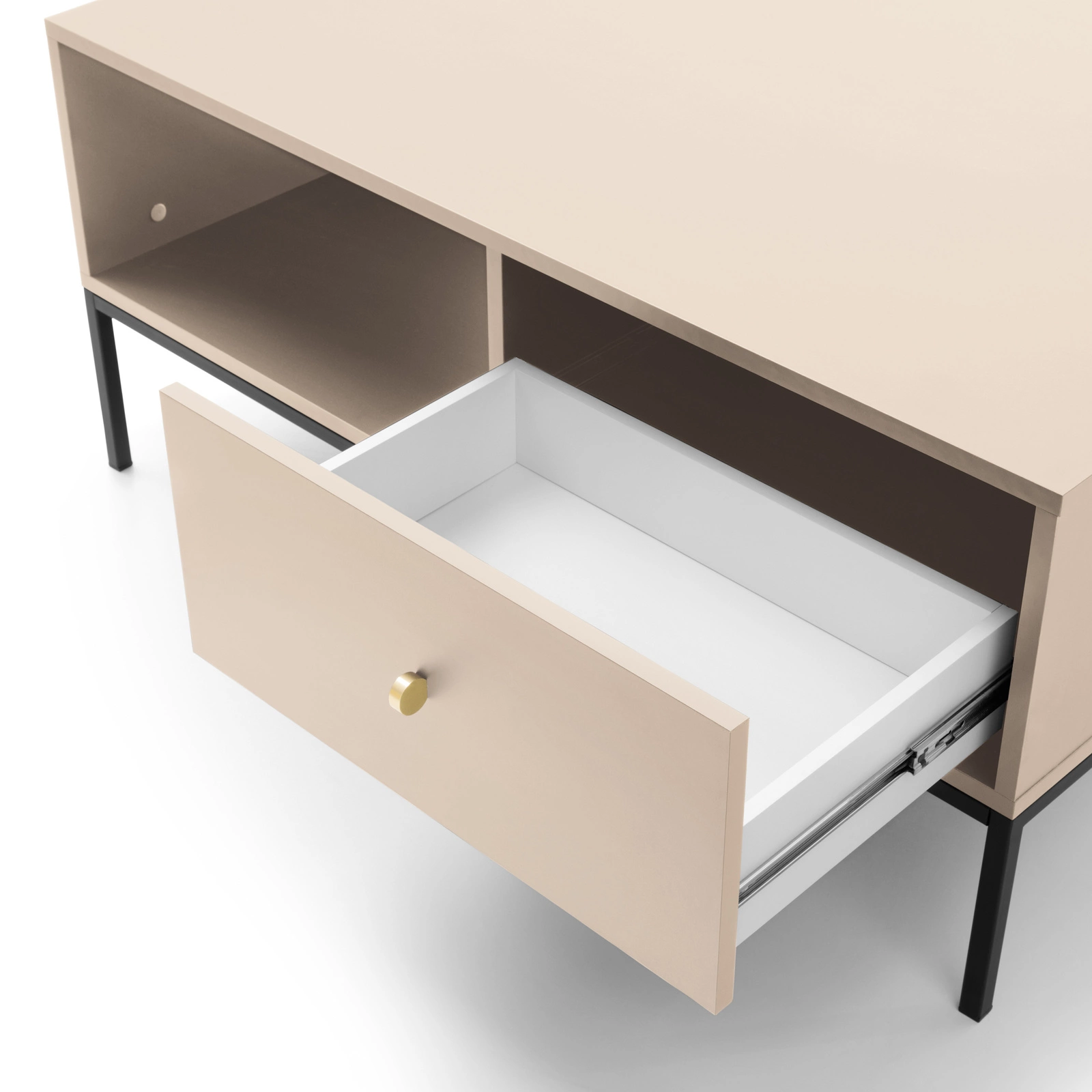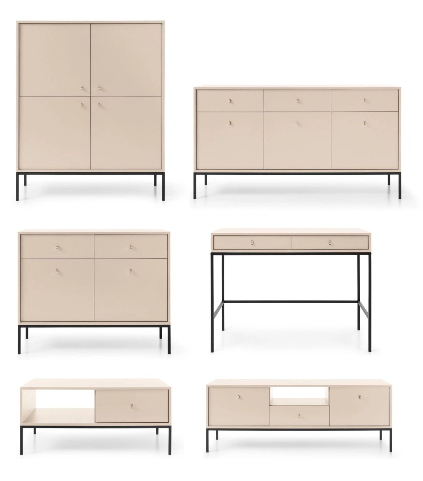 Przemyślany projekt sprawia, że komody z kolekcji są bardzo praktyczne oraz przestronne. Wybór mebla o najbardziej interesujących nas wymiarach sprawia, że komoda bez wątpienia będzie odpowiedzią na Twoje wymagania. Do wyboru mamy wysoką komodę z szafkami oraz dwie niższe komody z szufladami i szafkami w których z łatwością przechowasz zarówno większe rzeczy, jak i wszystkie niezbędne drobiazgi. Nawet wypełnione po brzegi komody zachowują się stabilnie, ponieważ cała forma mebli jest oparta na czterech nogach. Pod meblami zmieści się każdy robot sprzątający, ponieważ jej konstrukcja osadzona jest na wysokich nóżkach. Ta zaleta ułatwia również tradycyjne odkurzanie, a także mycie podłogi mopem. Ciekawym dopełnieniem kolekcji jest stolik kawowy. Ponadczasowy stolik posiadający szufladę oraz półkę, a jednocześnie o dość uniwersalne wielkości, dzięki czemu bez żadnych przeszkód możesz wstawić go do pomieszczeń o różnorodnych metrażach.