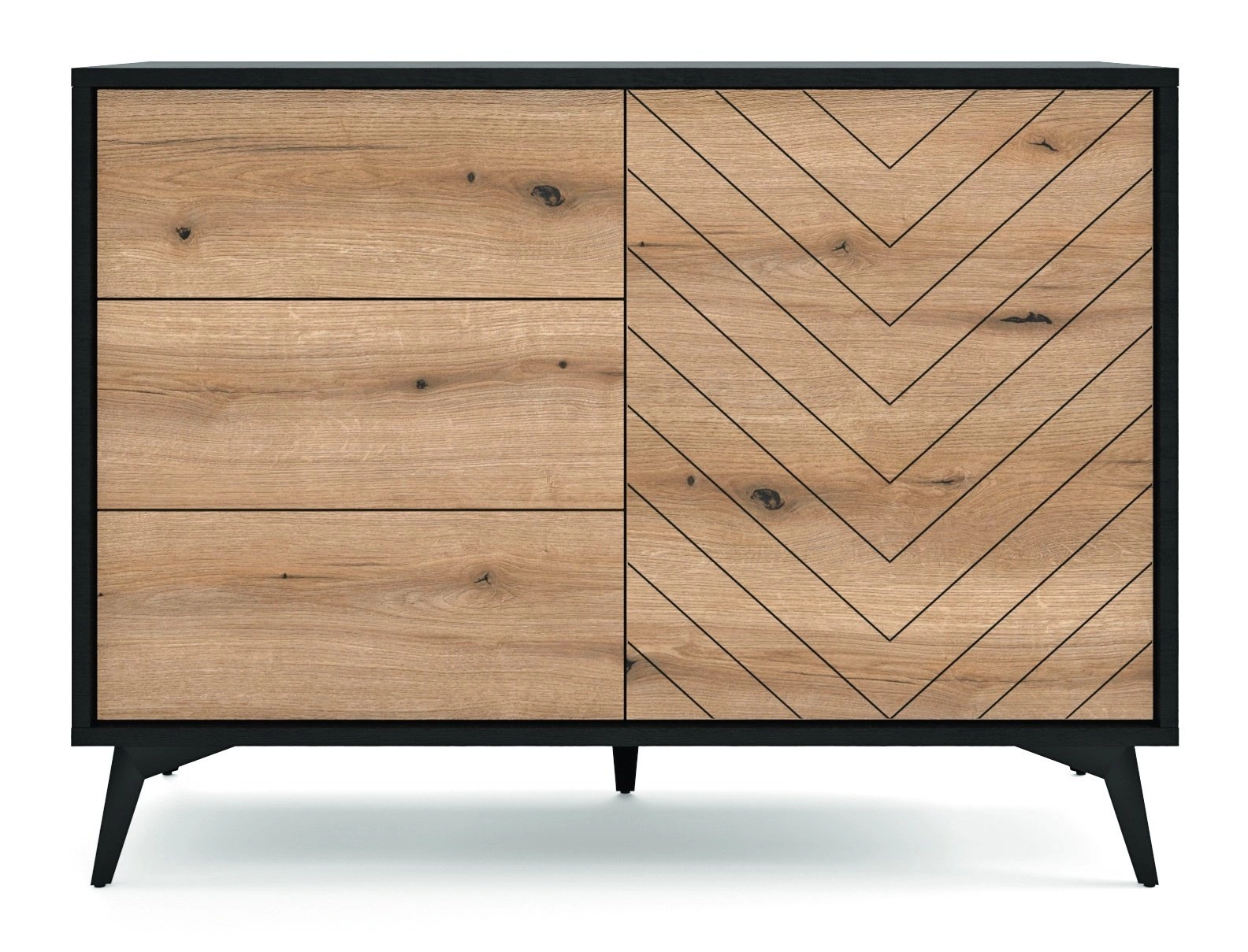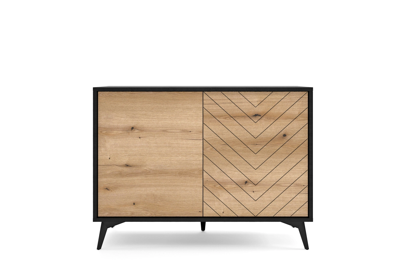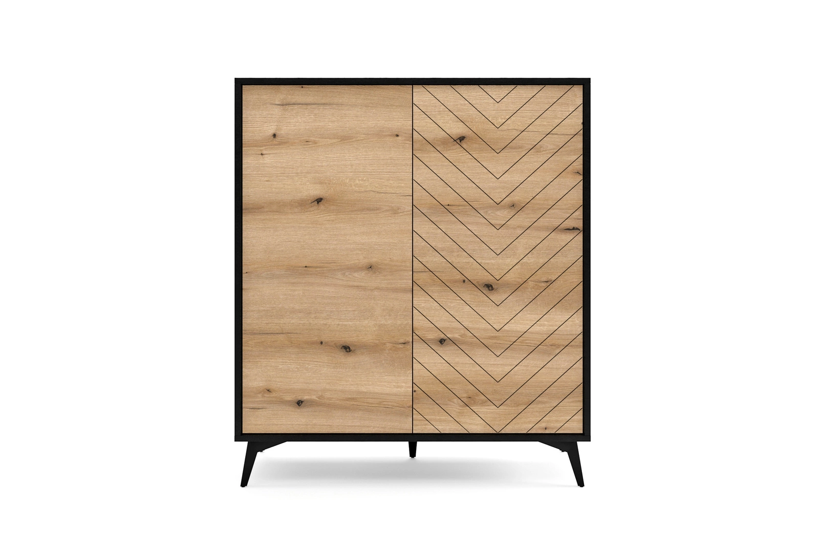 Zestaw mebli Fargo łączy styl skandynawski z nutą nowoczesności, tworząc niepowtarzalny design, który rozświetla każde pomieszczenie. Kompleksowy zestaw mebli do salonu, który obejmuje komody, stolik kawowy, witrynę i szafkę RTV, jest zarówno funkcjonalny, jak i estetyczny. Unikalny wzór jodełki na frontach mebli dodaje charakteru, a połączenie czerni z naturalnym odcieniem drewna, sprawia, że zestaw pasuje do różnych aranżacji wnętrz.