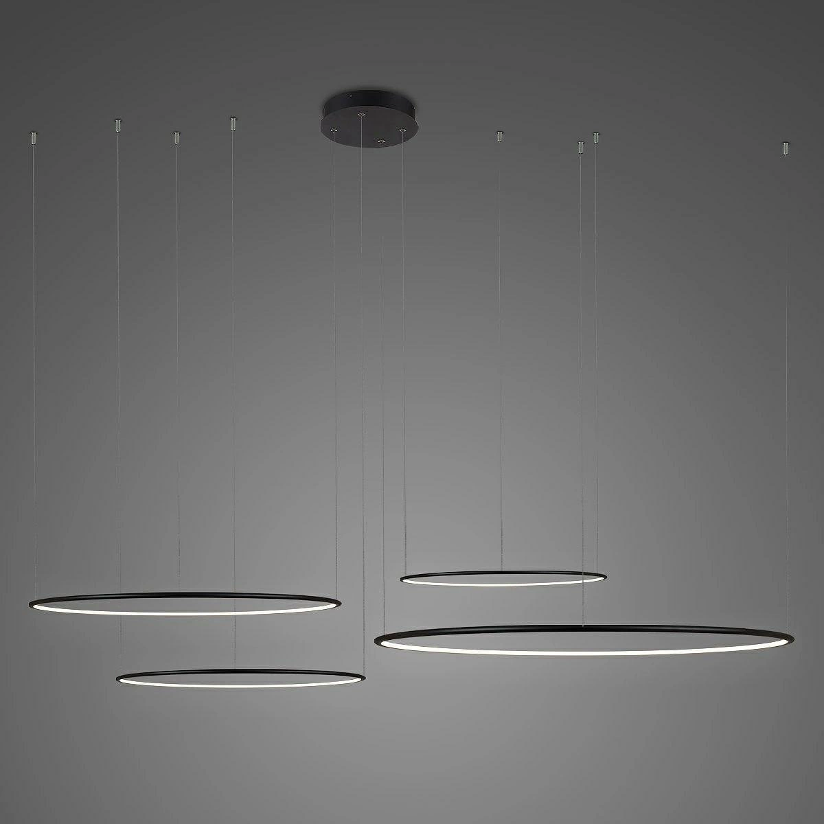 Lampa sufitowa LED Ledowe Okręgi 100 cm marki ALTAVOLA DESIGN to nowoczesna propozycja oświetlenia, która łączy minimalistyczną formę z funkcjonalnością. Wykonana z trwałego metalu oraz tworzywa o matowej, czarnej barwie, wyróżnia się imponującą szerokością 100 cm i możliwością regulacji wysokości do 200 cm. Ten designerski żyrandol LED oferuje ściemnianie światła, co pozwala idealnie dopasować nastrój w salonie, jadalni lub nad stołem.