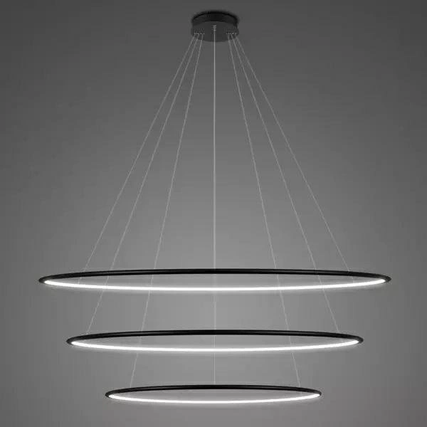 Lampa wisząca LED Ledowe Okręgi 120 cm marki ALTAVOLA DESIGN to nowoczesna propozycja oświetlenia sufitowego, która łączy minimalistyczną formę z imponującą średnicą i funkcjonalnością. Wykonana z metalu i tworzywa, w eleganckim czarnym kolorze, wyposażona została w trzy zintegrowane źródła LED o barwie światła 4000K. Model ten posiada regulowaną wysokość do 120 cm, co pozwala na indywidualne dopasowanie do wnętrza salonu, jadalni lub nad wyspę kuchenną.