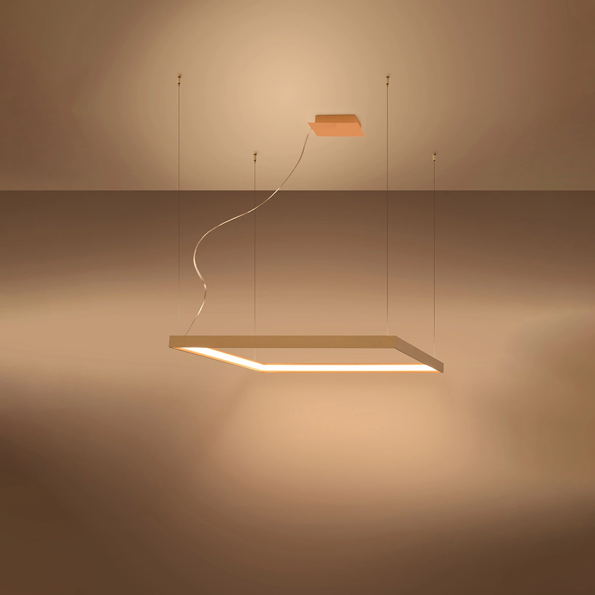 Żyrandol Nelya to lampa, która bardzo wydajnie oświetli przestrzeń, jednocześnie będąc ozdobą i minimalistycznym dodatkiem. Kwadratowy kształt lampy sprawia wrażenie ażurowego i unoszącego się w powietrzu dzięki systemowi linek, które prawie niewidocznie podtrzymują go. Przedmiot dostępny jest w trzech eleganckich kolorach: złotym, białym i czarnym. Przez swój industrialny design pasował będzie zarówno do salonów, ale również nad stół jadalny czy do przedpokoju. Sprawdzi się także jako dodatek do przestrzeni restauracyjnej, hotelowej czy sklepu.