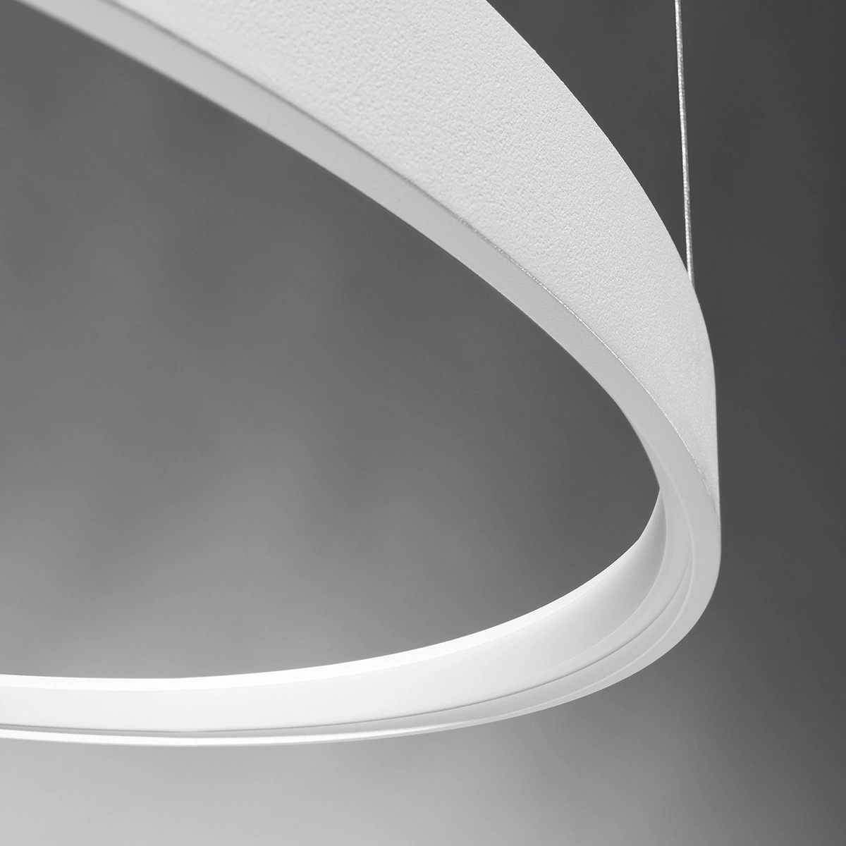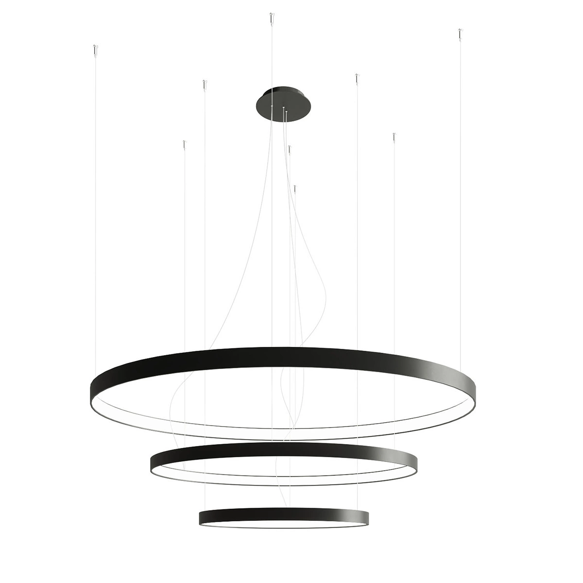 Żyrandol Rio zaprojektowany został w zdobnym i ażurowym stylu. Jego elegancka konstrukcja wydaje się lewitować w powietrzu dzięki systemowi niewidocznych żyłek podtrzymujących klosz. Klasyczny kolor połączenia czerni z bielą i uniwersalny wygląd w stylu industrialnym będą pasować do wnętrz w nowoczesnym czy skandynawskim stylu. Żyrandol stworzony jest z trzech okrągłych lamp, największej o średnicy 110cm, środkowej 78cm i najmniejszej obręczy 55cm.