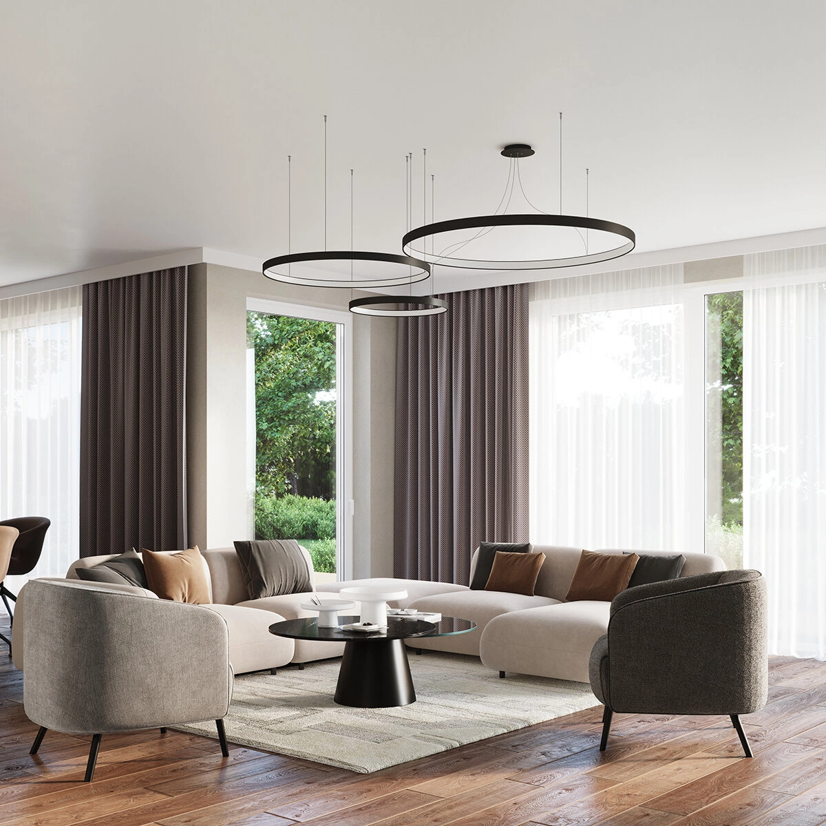 Żyrandol Rio to przede wszystkim funkcjonalność. Okrągła lampa to gwarant wydajnego i równomiernego rozprowadzenia światła po przestrzeni, a dołączona w zestawie żarówka LED wystarczy na cały czas użytkowania lampy. Do wyboru otrzymujesz trzy rozmiary lampy: 55, 78 i 110 cm w średnicy. Dostępne są również różne kolory światła żarówki. W zależności od potrzebnej barwy, w zestawie dołączona może być żarówka o ciepłym (3000K) lub zimnym (4000K) odcieniu bieli. Ten nowoczesny i elegancki żyrandol pasował będzie zarówno do salonu, jak też do jadalni czy przedpokoju. Świetnie sprawdzi się również w hotelu, restauracji czy sklepie.