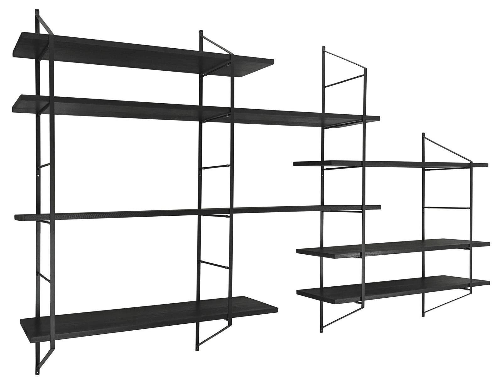 Regał stanowi szeroka konstrukcja wykonana z metalowych płaskowników pomalowanych proszkowo na czarno. Posiada siedem półek z drewna paulowni. Zostały one zabezpieczone lakierem i pomalowane na czarny kolor. Taki dobór materiałów zapewnia stylowy wygląd, a także odpowiednią trwałość.