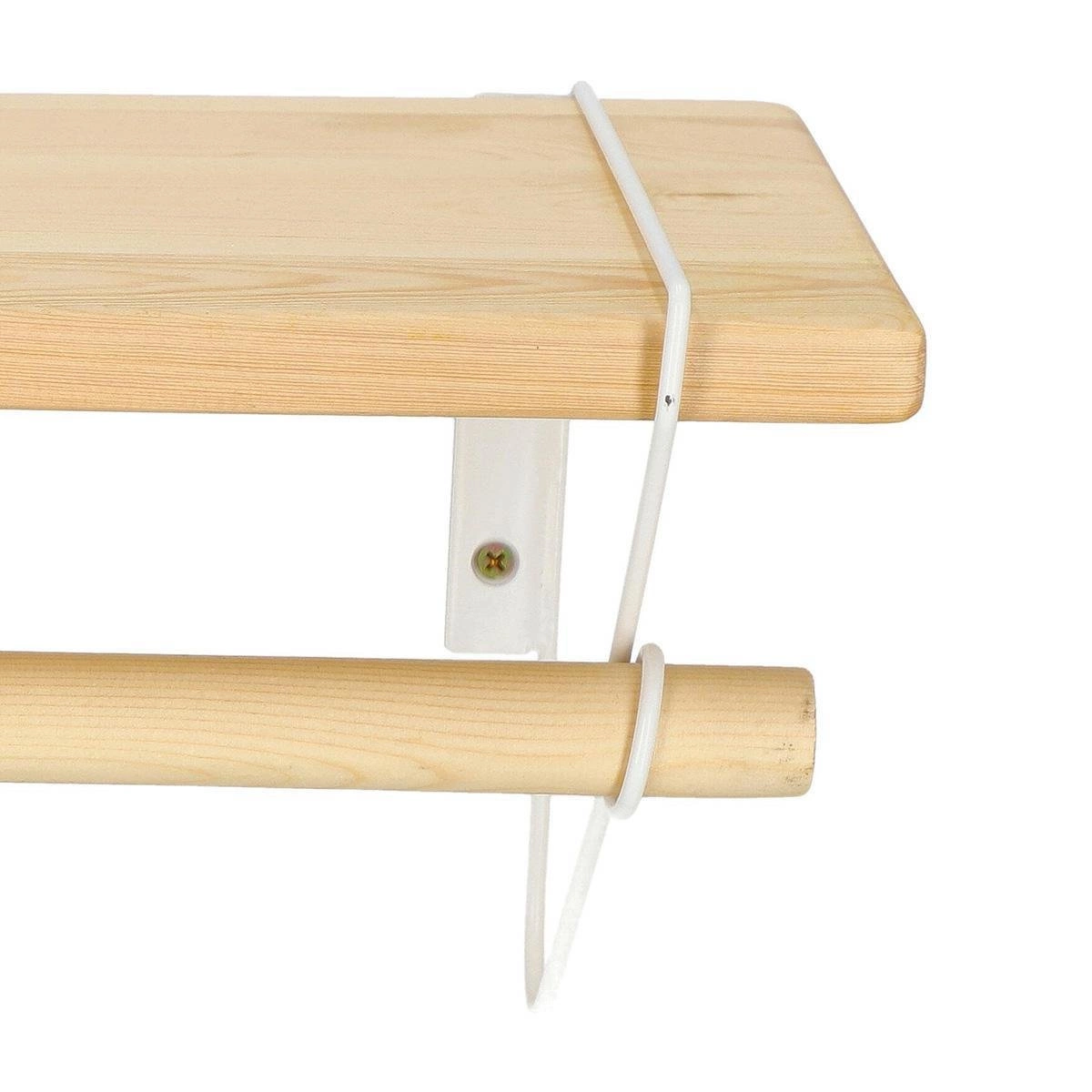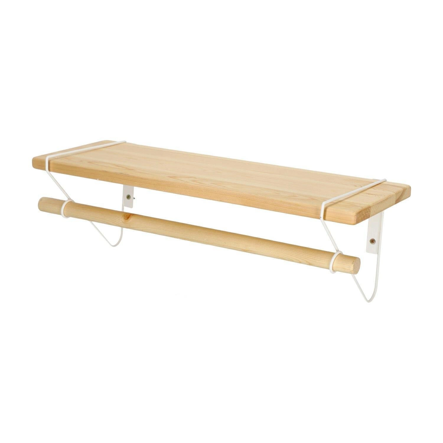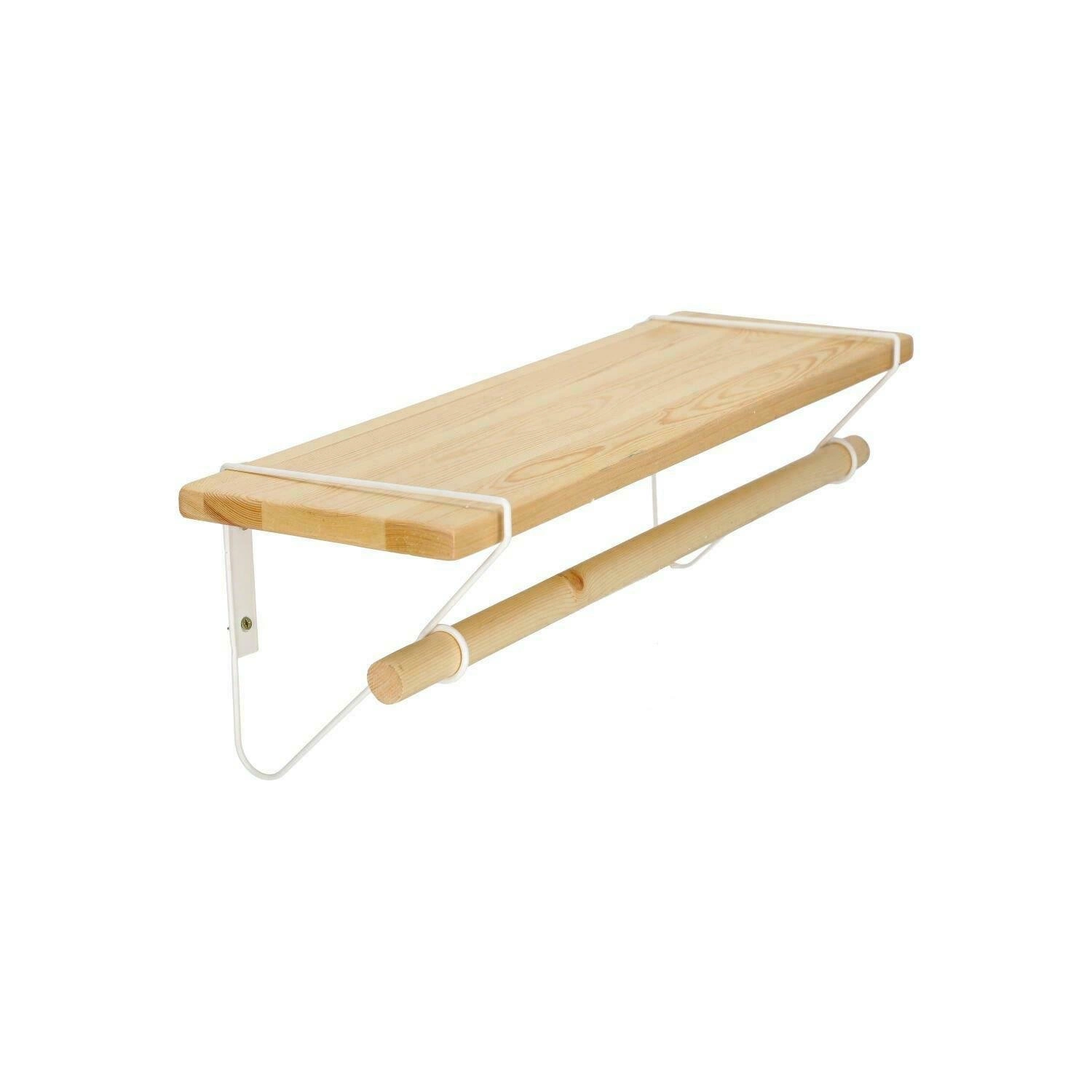 Drewniana półka o białych metalowych wspornikach to idealny wieszak do jasnego wnętrza w stylu skandynawskim. Półka Bish została wykonana z naturalnego drewna połączonego z białymi elementami. Półka posiada dodatkowy drewniany drążek, na którym możemy wieszać wieszaki z kurtkami. Półka sprawdzi się w niewielkim przedpokoju. Wymiary opakowania: 6x17x63 cm