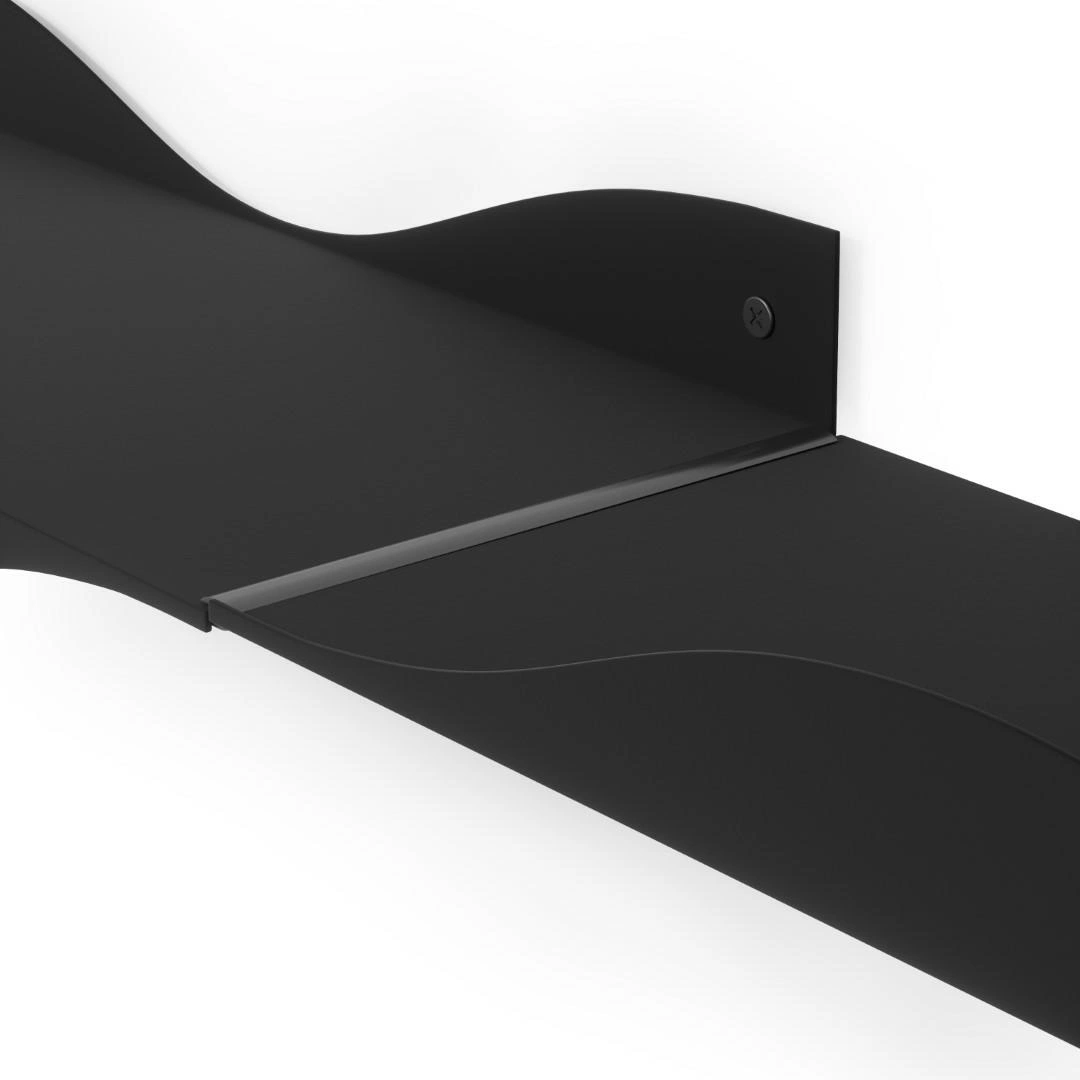 Czarne metalowe półki Surf przyciągają wzrok nietuzinkową formą i subtelną linią, która doskonale wpisuje się w industrialny oraz nowoczesny styl wnętrz. Ich lekka konstrukcja sprawia, że idealnie prezentują się zarówno solo, jak i w zestawie – możesz zamontować je obok siebie lub na różnych wysokościach, tworząc efektowną, a jednocześnie praktyczną dekorację ściany. Półki ścienne tego typu świetnie sprawdzą się jako miejsce na książki, ulubione ramki ze zdjęciami lub designerskie dodatki.