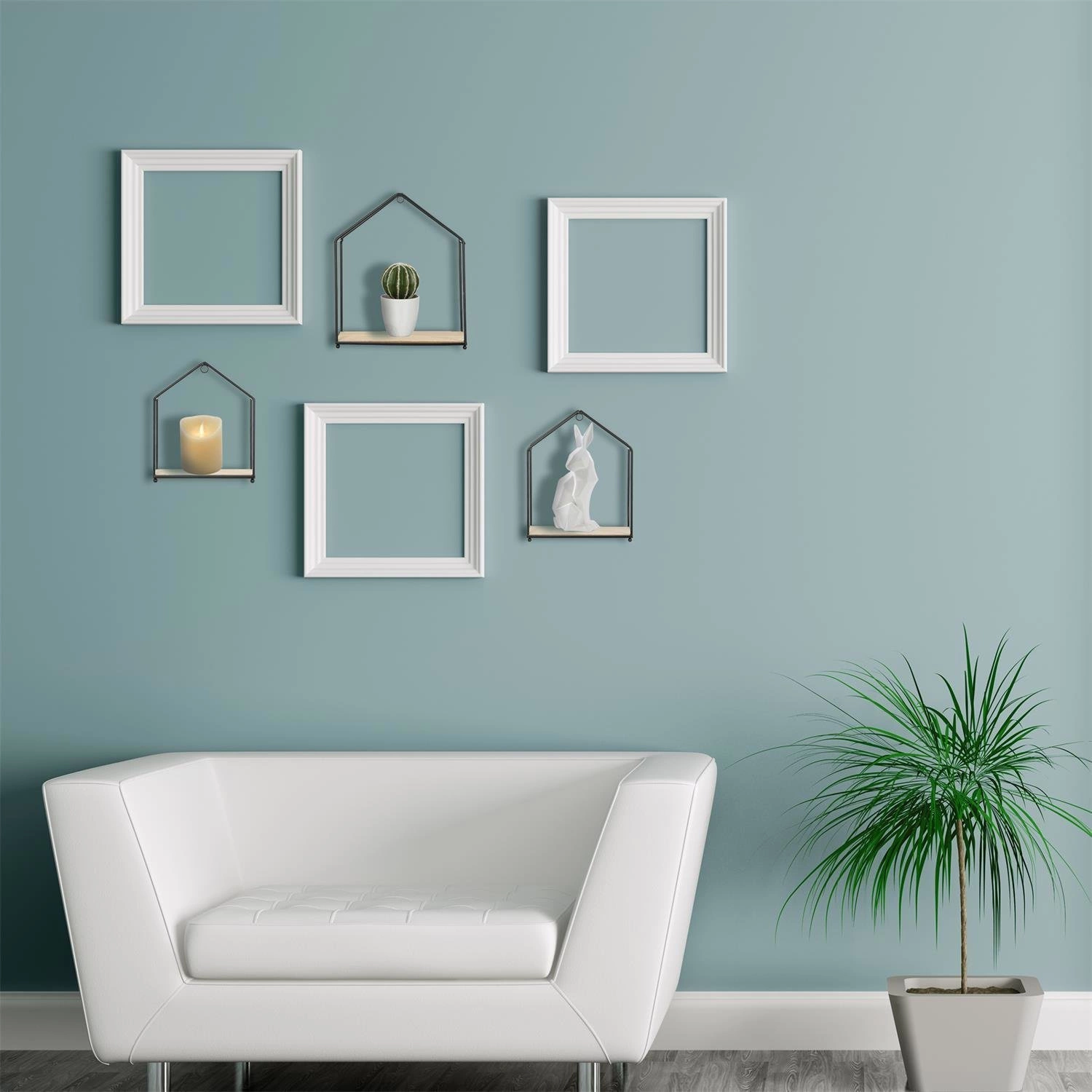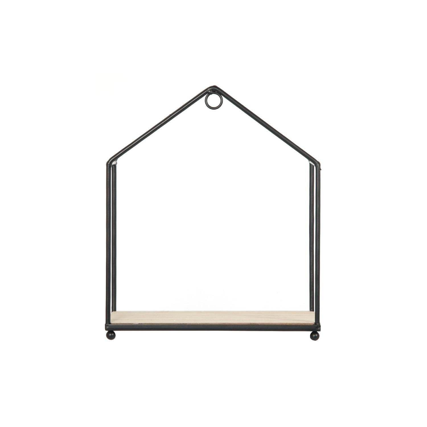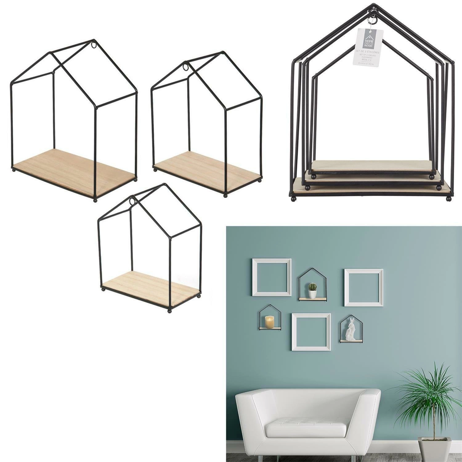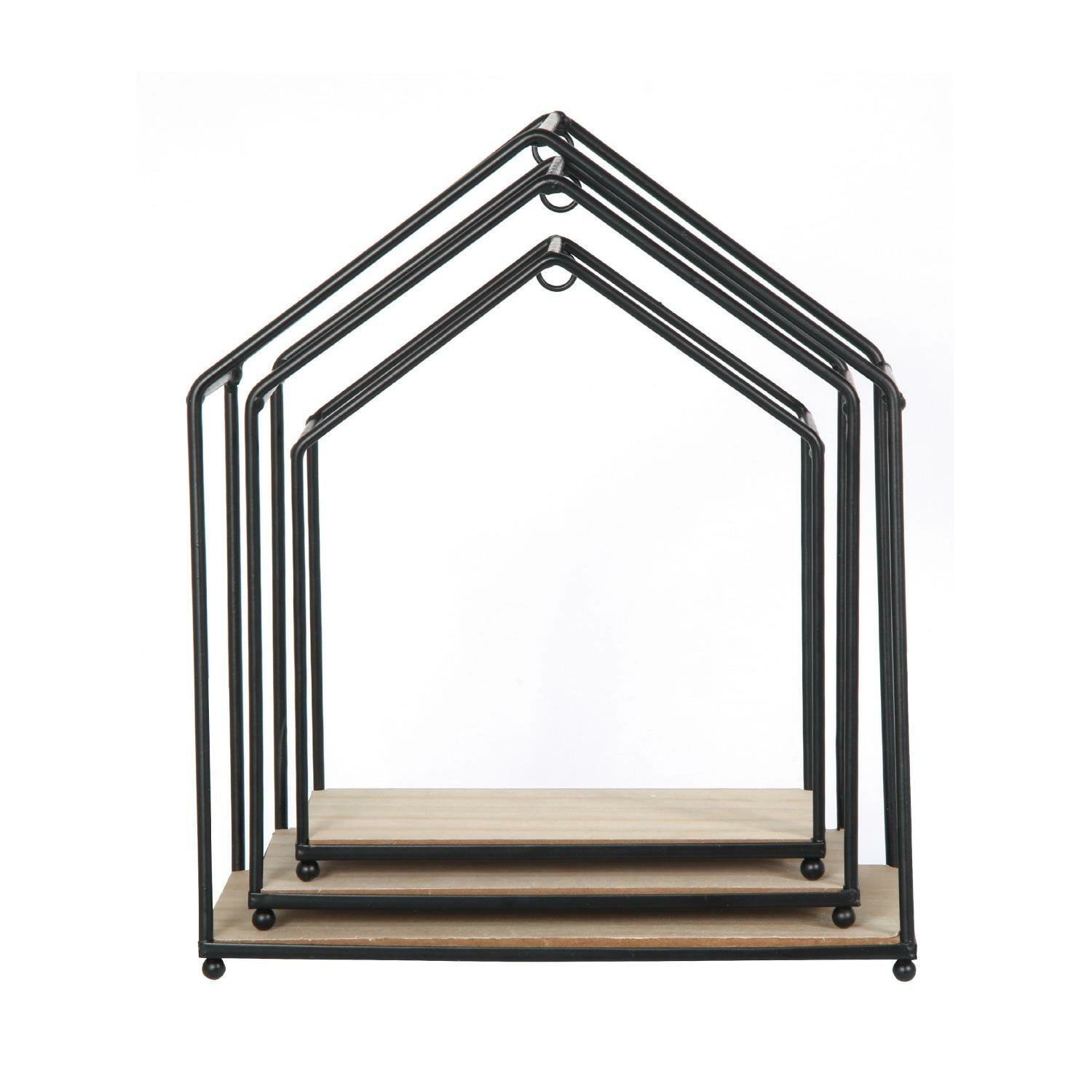 Podążaj za przewodowym i industrialnym trendem dzięki tym trzem półką w kształcie domu! Modele te wykonane są z drewnianej płyty MDF i metalu. Wprowadzą dekoracyjną i oryginalną nutę do Twojego wnętrza, jednocześnie umożliwiając przechowywanie ulubionych książek, kwiatów lub niektórych osobistych przedmiotów do wyeksponowania. Szczegół: Konstrukcja do zakładania lub mocowania - Wymiary: 23x27x13 cm - 20x24x11 cm - 17,5x20,5x9,5 cm.