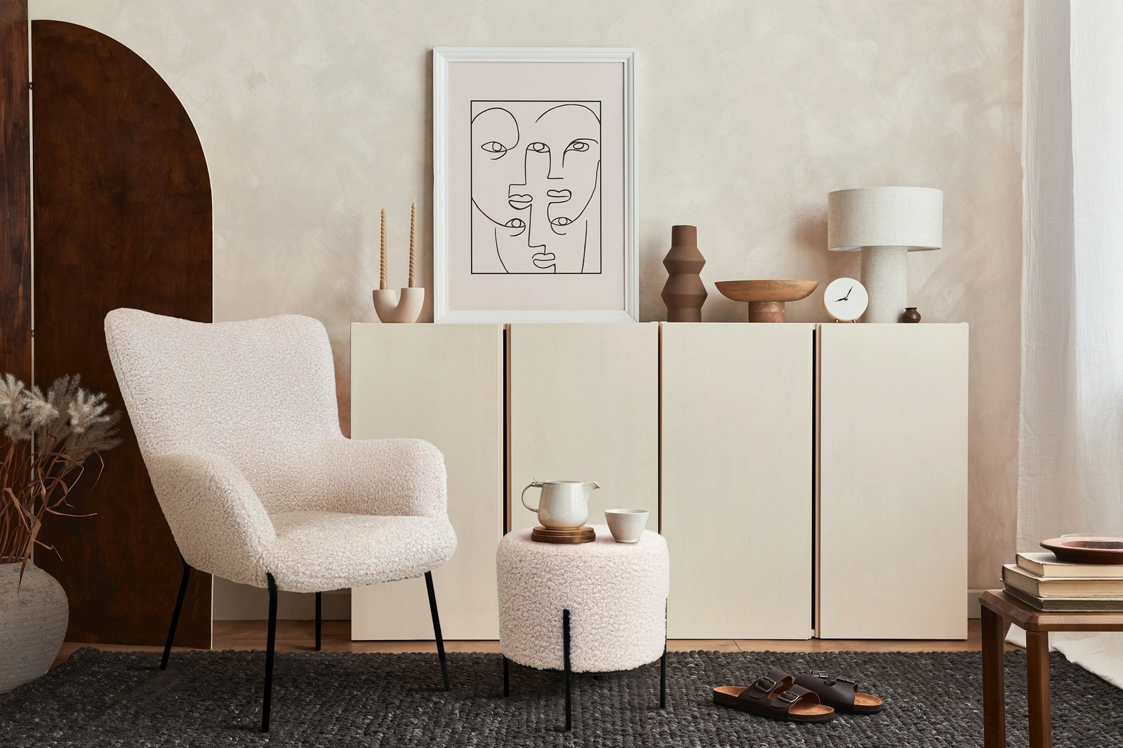 Na uwagę zasługuje tapicerka pufy Alford. Wykorzystana tkanina przypomina wyglądem i fakturą owczą wełnę. Jest miękka i przyjemna w dotyku, a także stanowi modny element designu.