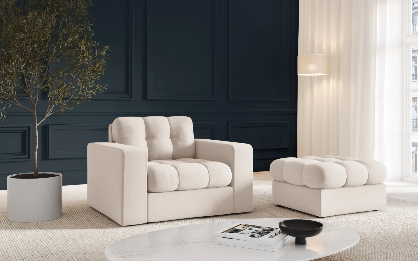 Pufa Justin Light Beige Structured Fabric – połączenie stylu i komfortu