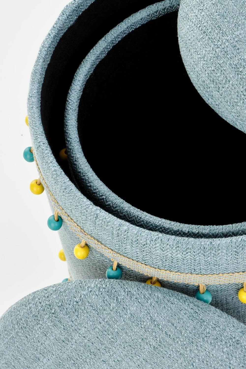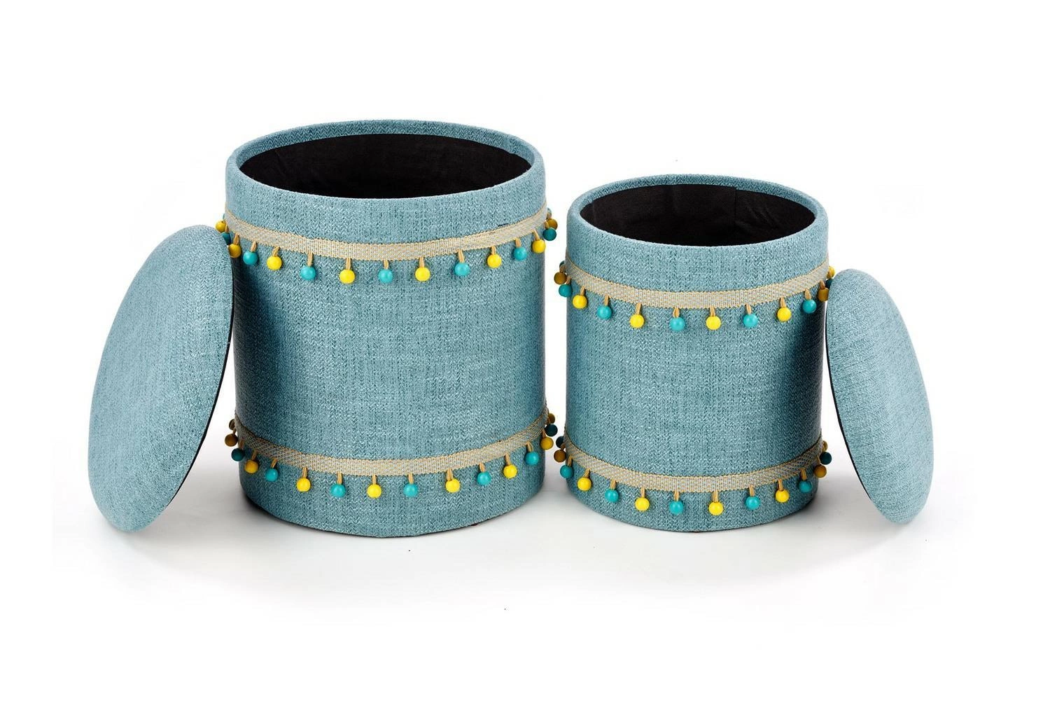 Zestaw 2 puf Eblis z pojemnikiem Zestaw 2 puf Eblis to niezwykle urocze i praktyczne meble, które wprowadzą radość i kolor do Twojego wnętrza. Dzięki swojemu wyjątkowemu designowi, będą one stanowić nie tylko funkcjonalne miejsce do siedzenia, ale także stylowe akcenty, które ożywią każde nowoczesne wnętrze. Wykonane z przyjemnej w dotyku tkaniny o delikatnym, jasnym niebieskim kolorze, pufy Eblis dodadzą subtelności i świeżości Twojemu pomieszczeniu. Ich żywe kolory dodają energii i radości, sprawiając, że wnętrze staje się bardziej przytulne i przyjemne dla oka. Dodatkowo, ozdoby w postaci żółto-niebieskich koralików nadają pufom Eblis uroku i wyjątkowego charakteru. To małe detale, które sprawiają, że meble stają się wyjątkowe i unikalne.Jedną z największych zalet tego zestawu jest funkcja pojemnika, która pozwala na praktyczne przechowywanie drobnych przedmiotów, zabawek czy innych akcesoriów. To doskonałe rozwiązanie, które pozwala na utrzymanie porządku w pomieszczeniu i organizację przestrzeni. Nie tylko masz wygodne miejsce do siedzenia, ale także dodatkową opcję do przechowywania. Dodatkową zaletą jest możliwość schowania mniejszej pufy w większej, co pozwala zaoszczędzić przestrzeń, gdy nie są one używane. To szczególnie przydatne w mniejszych pomieszczeniach, gdzie liczy się optymalne wykorzystanie miejsca. Dzięki temu zestaw puf Eblis jest nie tylko praktyczny, ale także ekonomiczny. Zestaw 2 puf Eblis to nie tylko meble, ale także wyrazisty element dekoracyjny. Doskonale sprawdzą się zarówno w pokoju dziecięcym, gdzie wprowadzą radość i kolor, jak i w salonie czy sypialni, gdzie będą stanowić stylowy akcent. Niezależnie od miejsca, w którym je umieścisz, pufy Eblis z pewnością dodadzą charakteru i uroku Twojemu wnętrzu. O czym musisz wiedzieć przed zakupem? Funkcja pojemnika pozwala na wygodne przechowywanie drobnych przedmiotów, co czyni je idealnymi dla pokoju dziecięcego Ich kolor ożywi nowoczesne wnętrze, dodając mu energii i radości Możliwość schowania mniejszej pufy w większej jest praktycznym rozwiązaniem pozwalającym zaoszczędzić przestrzeń
