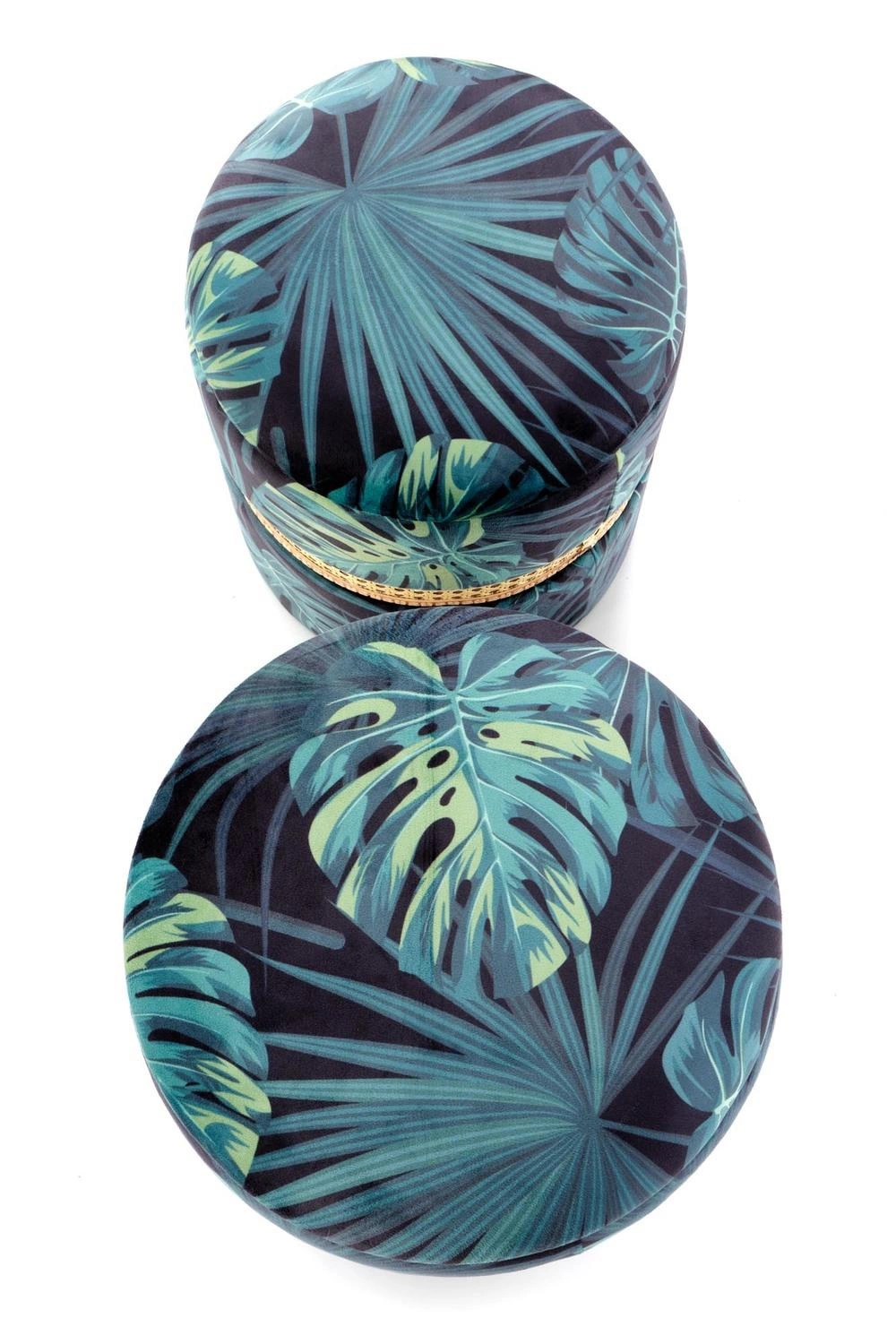 Zestaw 2 puf Dadra zielone ze schowkiem Zestaw 2 puf Dadra ze schowkiem to praktyczne i stylowe rozwiązanie, które doda uroku Twojemu wnętrzu. Stanowią idealny dodatek do Twojego przedpokoju lub salonu. Wybierz Dadrę, aby dodać przytulności i charakteru swojej przestrzeni, jednocześnie ciesząc się możliwością ukrycia drobnych przedmiotów w eleganckich pojemnikach. Zestaw składa się z dwóch puf o wymiarach h44/fi36 oraz h38/fi32 cm. Wykonane są z trwałej i eleganckiej tkaniny oraz rattanu syntetycznego, a przeważający kolor ciemnej zieleni i granatu nadaje im wyjątkowego uroku. Mniejsza pufa jest zaprojektowana tak, aby pasować idealnie pod większą, pozwalając zaoszczędzić miejsce, gdy nie są używane. Dodatkowo, ozdobienie puf rattanem nadaje całości uroku i sprawia, że zestaw prezentuje się niezwykle stylowo i nowocześnie. Upewnij się, że to dobry wybór! Zestaw Dadra to funkcjonalne i stylowe rozwiązanie do Twojego wnętrza. Składa się z dwóch puf w różnych rozmiarach - większej i mniejszej. Tkanina w kolorze ciemnej zieleni i granatu nadaje meblowi wyjątkowego uroku. Funkcja schowka zapewnia dodatkową praktyczność i miejsce do przechowywania. Tkaninę zdobi wzór liści, nadając im subtelny, naturalny charakter.