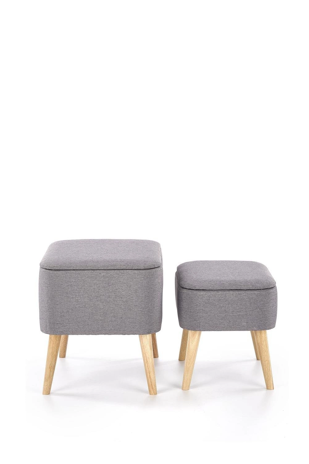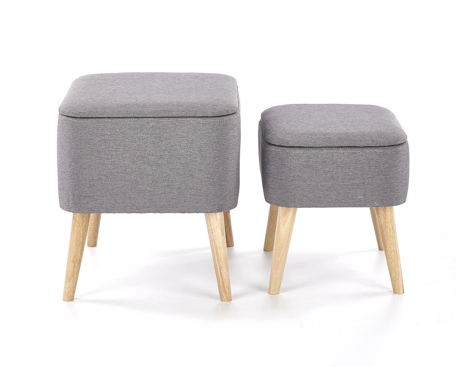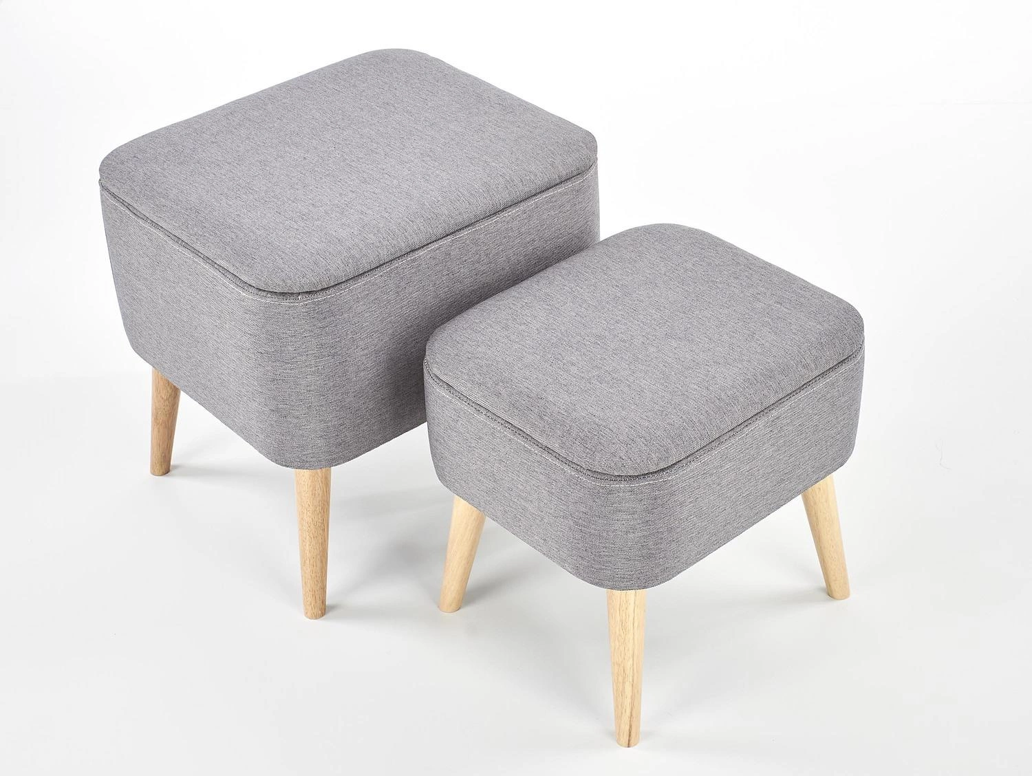 Zestaw 2 puf Gryf marki Intesi to nowoczesne, tapicerowane pufy w odcieniu jasnej szarości, osadzone na wysokich, naturalnych nogach z drewna. Każda pufa wyposażona jest w funkcjonalny schowek, dzięki czemu zyskujesz nie tylko wygodne miejsce do siedzenia, ale także dodatkową przestrzeń na przechowywanie drobiazgów. Prostokątny kształt oraz kompaktowe wymiary (wysokość 48 cm, szerokość 43 cm, głębokość 42 cm) sprawiają, że zestaw doskonale wpisuje się w aranżacje salonu, przedpokoju, sypialni czy pokoju dziecięcego.
