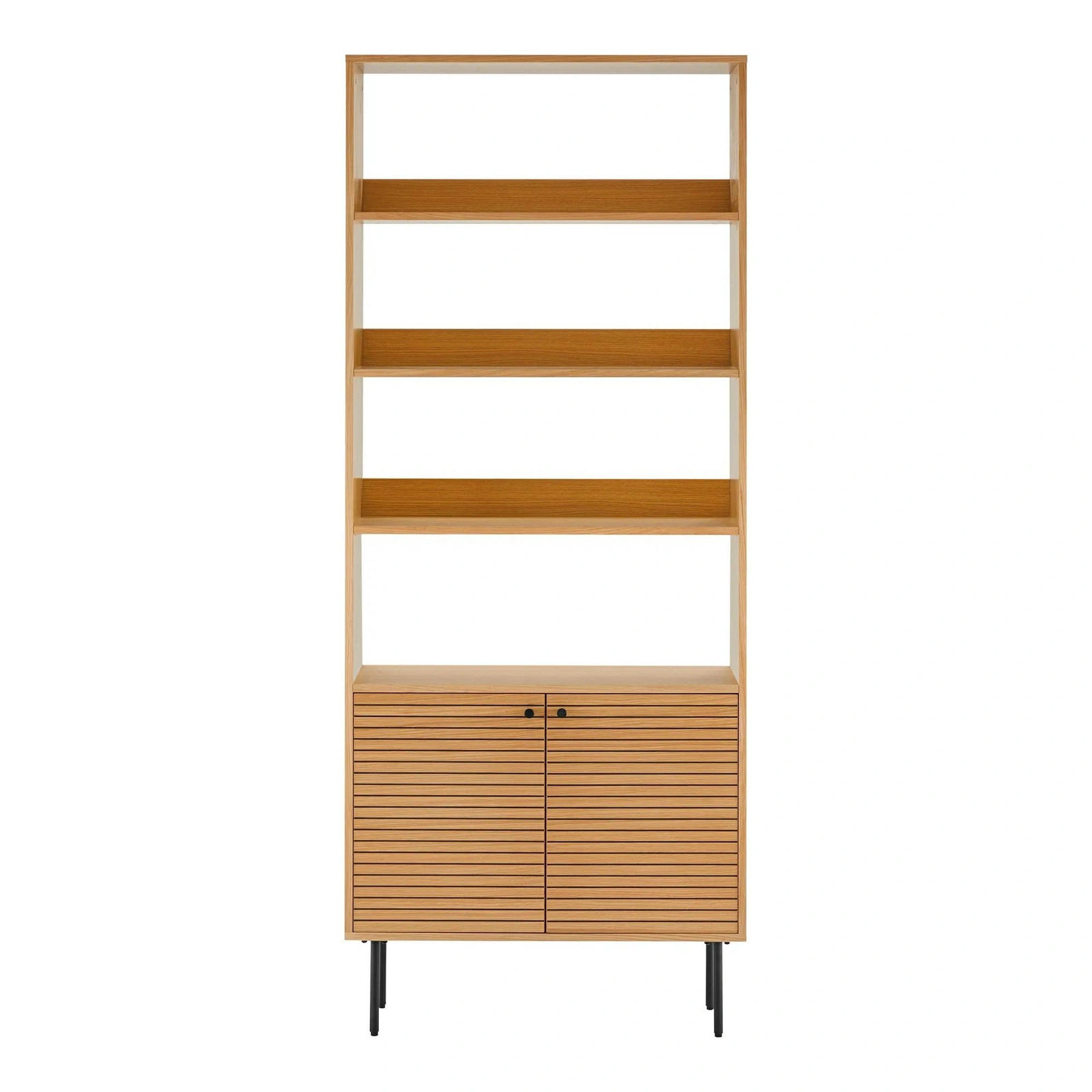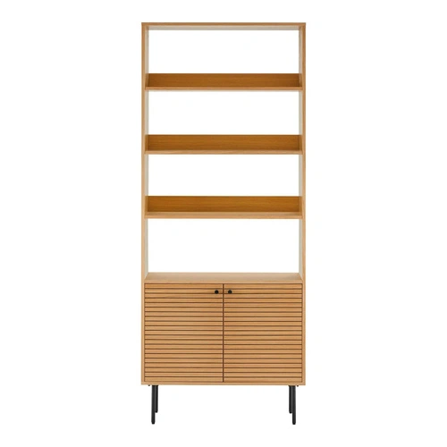 Regał Kyoto marki House Nordic to wysoki, skandynawski regał na książki o wymiarach 80×30×200 cm, wykonany z forniru dębowego w kolorze naturalnego dębu, osadzony na czarnej, stalowej podstawie. Cztery otwarte półki i zamykana szafka z ryflowanym frontem tworzą funkcjonalne miejsce do przechowywania w salonie, przedpokoju lub pokoju młodzieżowym.