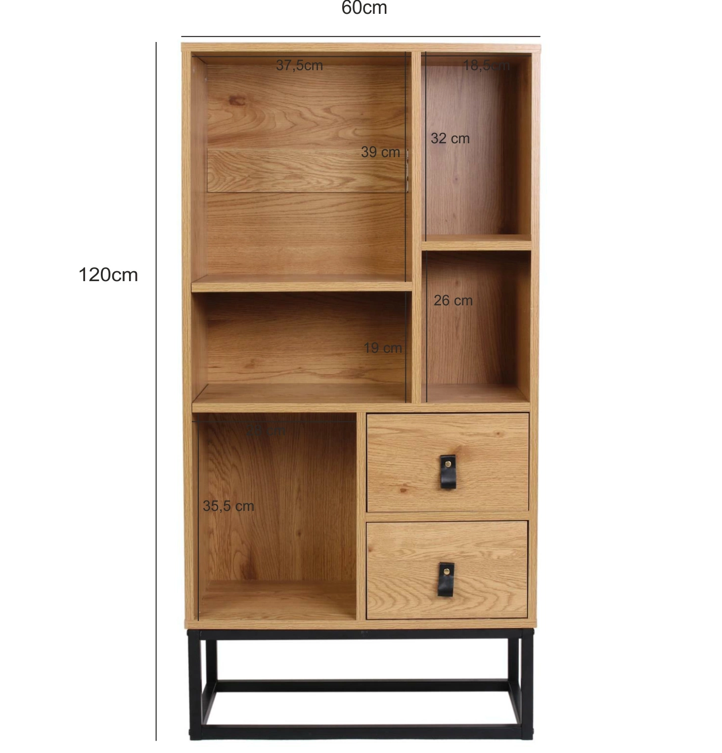 Wysoki regał Abbott będzie idealną propozycją dla tych, którzy szukają miejsca na dużą ilość drobiazgów. Będzie to idealny mebel na książki, domowe pamiątki, zdjęcia lub inne przedmioty, które zawsze chcesz mieć pod ręką. Regał dzięki swojej nietypowej budowie ma 5 pojemnych półek o różnych wielkościach, a do tego dwie pojemne szuflady z uchwytami z ciemnej skóry ekologicznej. Świetnie sprawdzi się jako regał do salonu w stylu industrialnym lub loft, a także w aranżacjach skandynawskich.