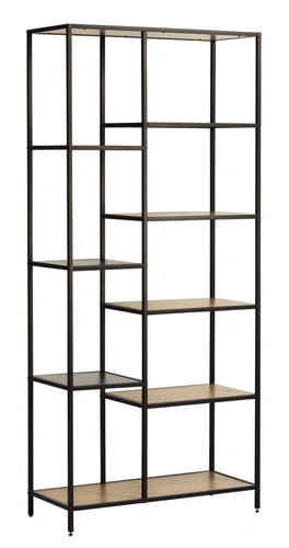 Regał Altino marki UNIQUE to loftowy regał na książki o wysokości 180 cm, łączący czarną metalową ramę z półkami w dekorze dąb. Ośmiopoziomowa konstrukcja oferuje dużo miejsca na przechowywanie, a smukła forma 80 × 35 cm sprawia, że regał idealnie sprawdzi się w salonie, biurze czy pokoju młodzieżowym.