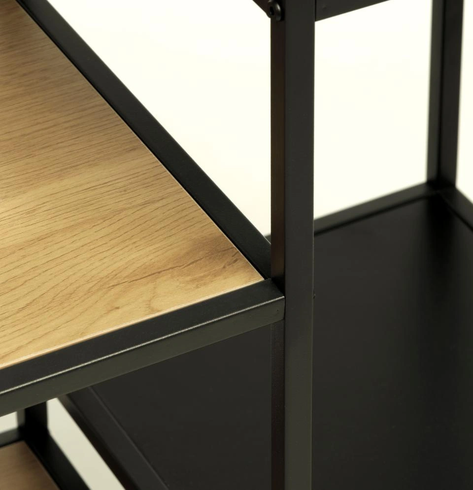 Czarna, stalowa konstrukcja na czterech nogach tworzy stabilną podstawę, która dobrze znosi codzienne użytkowanie. Półki pokryte okleiną w kolorze dębu ocieplają całość, dzięki czemu regał metalowy nie wygląda surowo, lecz wprowadza przytulny, loftowy klimat. Matowe wykończenie ogranicza widoczność odcisków palców i drobnych zarysowań, co przekłada się na estetyczny wygląd przez długi czas, nawet przy intensywnym użytkowaniu w salonie czy biurze.