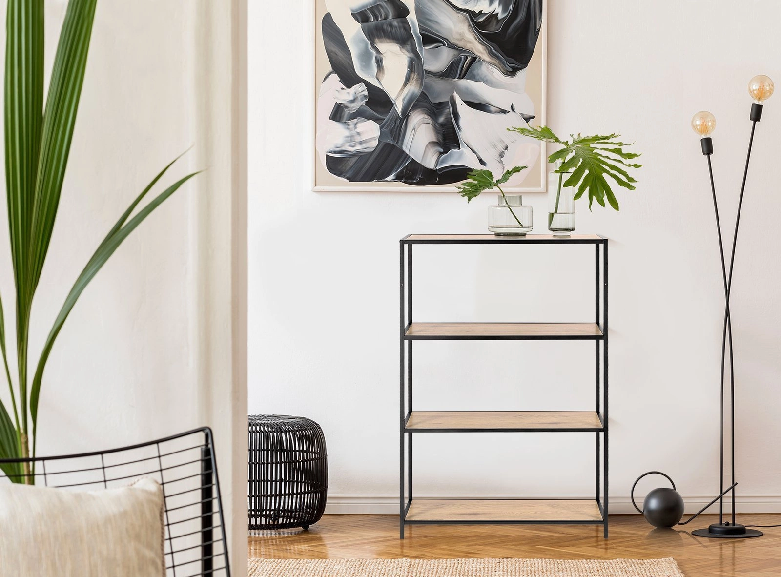 - 4 otwarte półki – swobodnie wyeksponujesz książki, dekoracje i rośliny