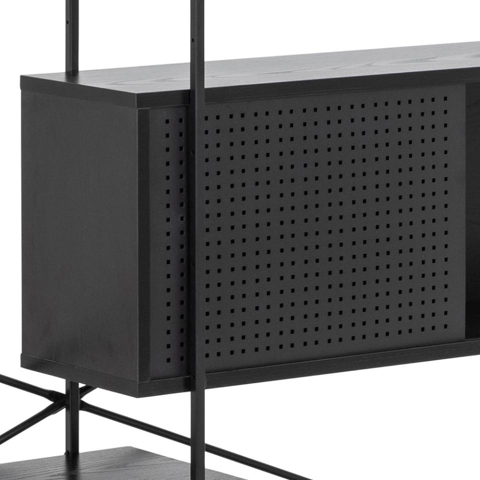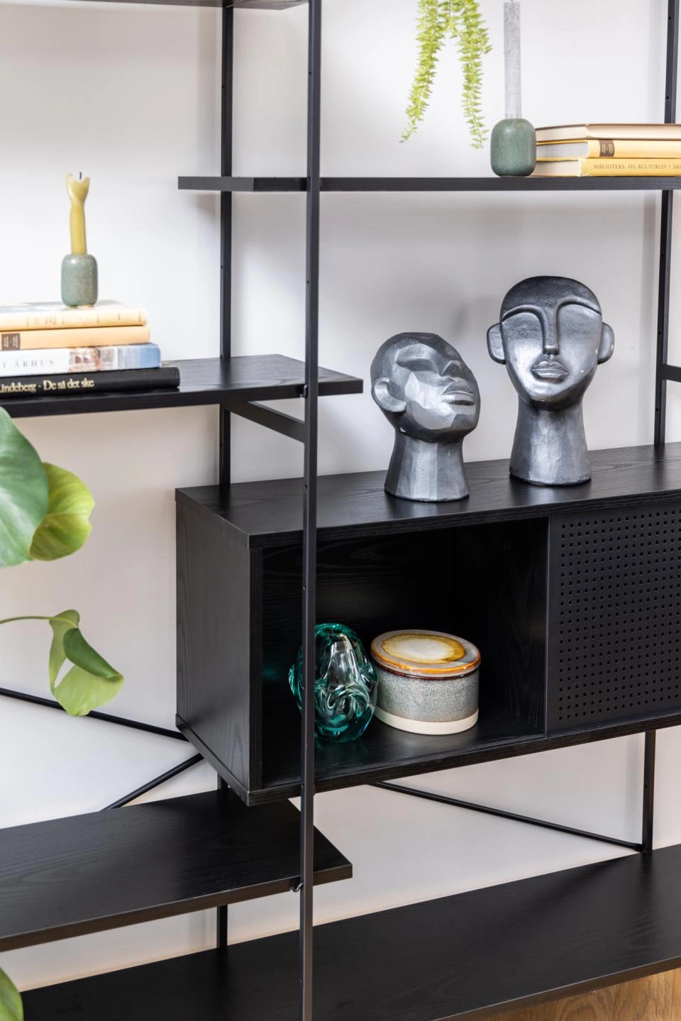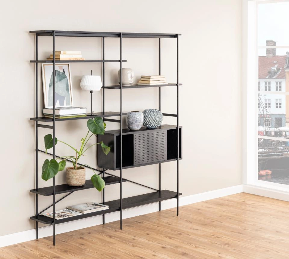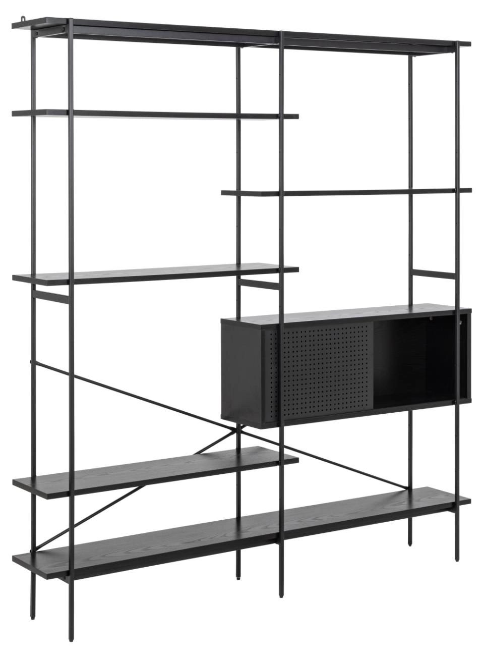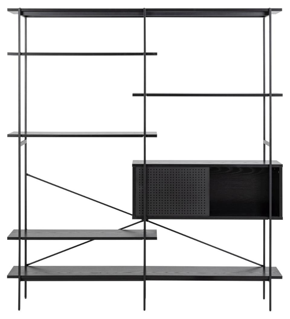 Regał Angus to industrialny regał do przechowywania dużej ilości książek, trofeów lub innych przedmiotów. To propozycja do salonu, do sypialni lub jako alternatywa dla pospolitych regałów do biura. Regał składa się z metalowego pomalowanego na czarno szkieletu oraz czterech krótszych i dwóch dłuższych półek. Półki zostały oklejone okleiną imitującą czarny jesion, co prezentuje się niezwykle elegancko. Ciekawym elementem regału jest szafka z metalowymi malowanymi proszkowo na czarno przesuwanymi drzwiczkami, w której możesz schować rzeczy, których nie chcesz eksponować. Ażurowy front szafki dodaje nonszalancji i industrialnego wyglądu.