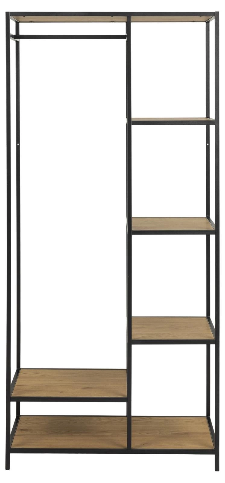 Regał metalowy Seaford marki Actona to wyrazisty mebel o szerokości 77 cm, zaprojektowany w stylu industrialnym. Połączenie czarnej, solidnej metalowej konstrukcji z półkami w kolorze naturalnego dębu tworzy funkcjonalny i designerski regał na ubrania, idealny do garderoby lub nowoczesnej sypialni. Pięć pojemnych półek pozwala wygodnie przechowywać odzież, akcesoria czy tekstylia, pomagając utrzymać porządek i podkreślając industrialny charakter wnętrza.
