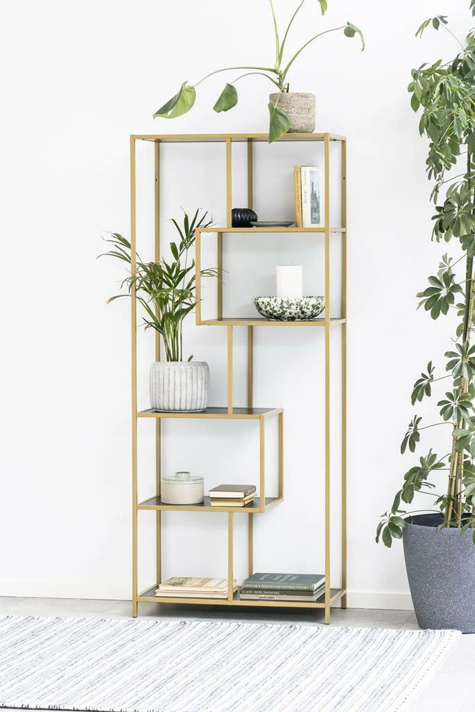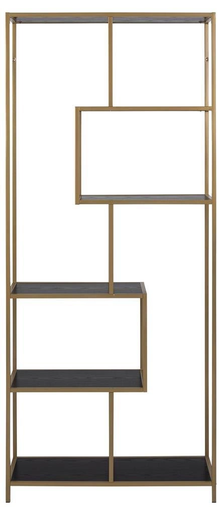 Seaford II wyróżnia się surową, industrialną estetyką podkreśloną przez kontrastowe połączenie złotego metalu z czarnymi półkami. Taka kolorystyka doskonale komponuje się z nowoczesnymi i loftowymi aranżacjami, wprowadzając do wnętrza odrobinę luksusu bez zbędnej przesady. Otwarte półki pozwalają na swobodną ekspozycję zarówno książek, jak i designerskich dodatków, a geometryczna forma nadaje regałowi nowoczesnego charakteru.