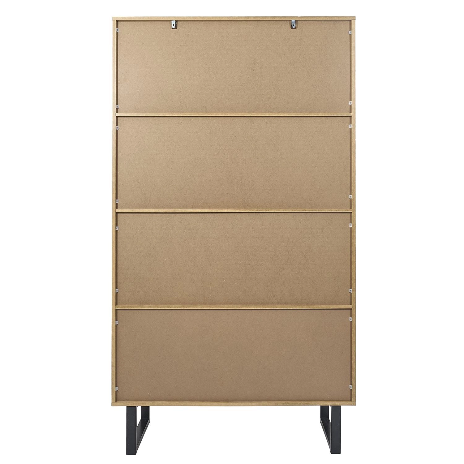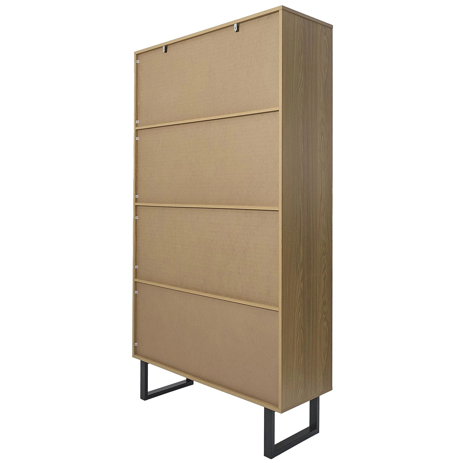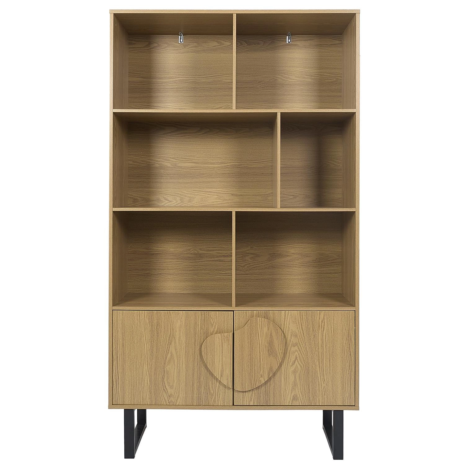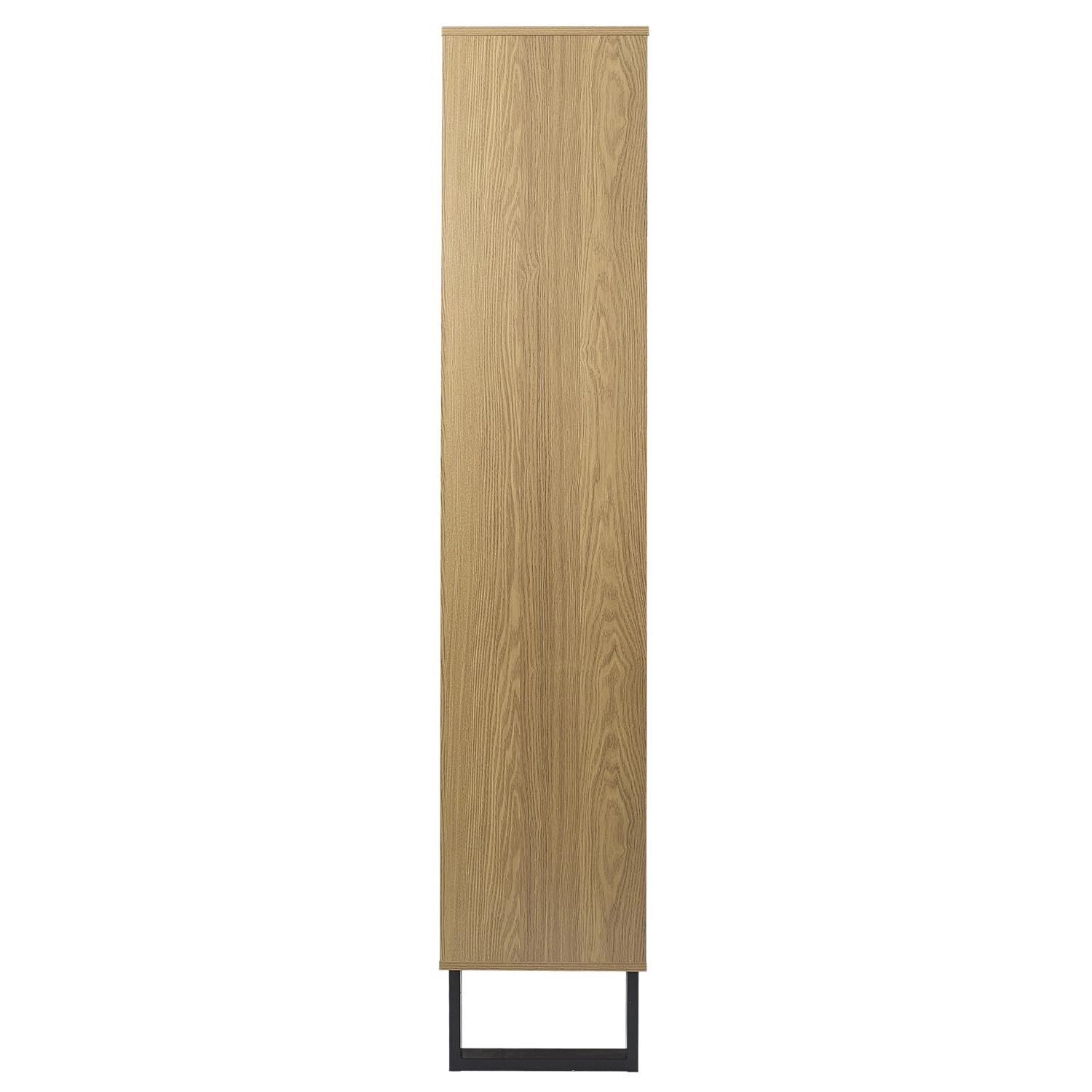 Stabilność regału gwarantują metalowe płozy oraz wytrzymała konstrukcja z płyty MDF pokrytej naturalną okleiną. To sprawia, że mebel jest trwały, a jednocześnie lekki wizualnie. Maksymalne obciążenie każdej półki wynosi 5 kg, więc bez obaw ustawisz na nich nie tylko książki, ale i dekoracje. Montaż regału jest szybki i intuicyjny, co pozwala cieszyć się nowym meblem niemal od razu po dostawie. Waga 42,2 kg zapewnia stabilność nawet przy intensywnym użytkowaniu.