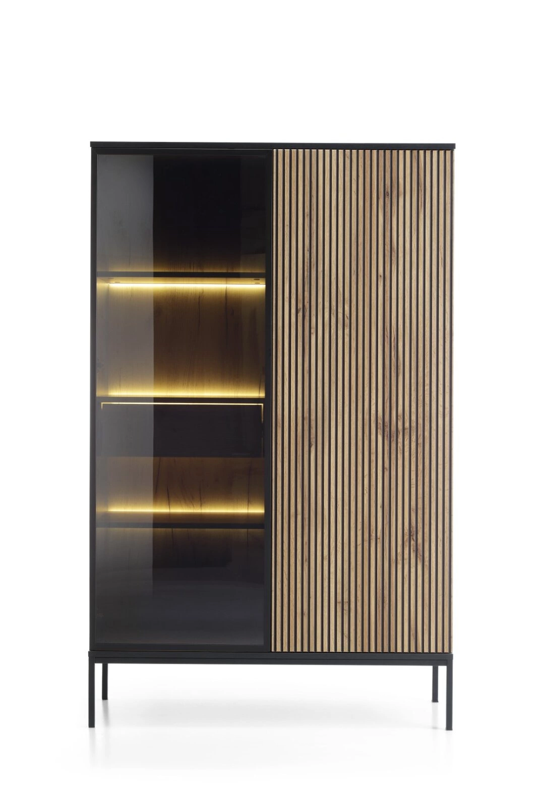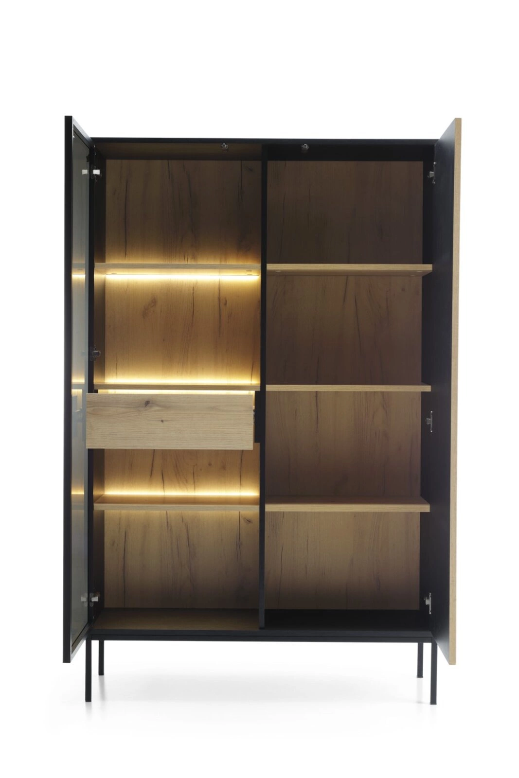 Witryna wysoka Novel dąb wotan/czarny Witryna Novel to elegancki mebel o uniwersalnych możliwościach aranżacyjnych. Jej praktyczny design i solidne wykonanie sprawiają, że doskonale wpisuje się w różne style wnętrz, zwłaszcza loftowy i nowoczesny. Mebel został wykonany z wysokiej jakości materiałów, takich jak płyta laminowana i MDF, metal oraz szkło hartowane. Połączenie głębokiej czerni z kolorem drewna dębu wotan z pewnością przykuje uwagę, a dodatkowe oświetlenie LED nie tylko doda ciepłego i przytulnego klimatu naszym wnętrza w jesienne wieczory, ale również ciekawie wyeksponuje przedmioty, które oświetlimy np. wyjątkowe książki lub ceramikę. Novel stoi na czterech nóżkach, co zapewnia stabilność i podkreśla jej stylowy wygląd. Posiada sześć półek oraz szufladę, które oferują dużo miejsca na przechowywanie różnych przedmiotów. Jedne z drzwi są ze szkła hartowanego, dzięki czemu doskonale sprawdzi się do eksponowania dekoracji czy ulubionych. Wykonanie witryny jest niezwykle staranne, a jej wygląd emanuje luksusem. Solidne materiały i precyzyjne wykończenie sprawiają, że mebel prezentuje się wyjątkowo atrakcyjnie i jest odporny na codzienne użytkowanie. Mebel jest idealnym rozwiązaniem dla salonu, biura lub sypialni. Jej uniwersalny charakter sprawia, że można ją łatwo dopasować do istniejącej aranżacji wnętrza, nadając mu nowoczesnego i stylowego wyglądu. Witryna jest elementem serii Novel. Upewnij się, że to dobry wybór! Jej kolorystyka dąb wotan - czarny pasuje do wielu stylów wnętrz, zwłaszcza loftowych i nowoczesnych. Mebel stoi na czterech nóżkach, co dodaje mu stabilności i podkreśla jego stylowy wygląd. Posiada ciepłe oświetlenie LED, które dodaje element przytulności. Sposób otwieranie push to open (odbojnik TITUS).