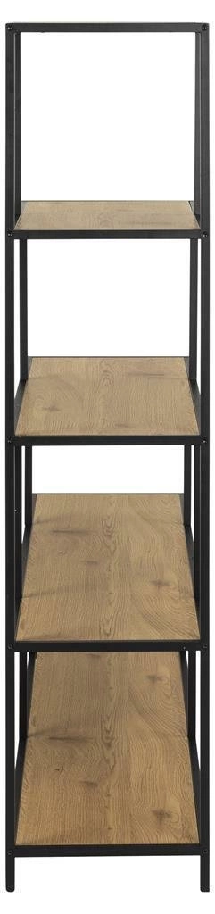 Regał schodkowy Seaford to mebel o bardzo nieoczywistej formie, dzięki której jest ciekawą ozdobą wnętrza. Nada się do gabinetu, salonu, a także pokoju dziecięcego. Jego szkielet wykonany został z metalu malowanego proszkowo na kolor czarny oraz uzupełniony półkami o różnej długości. Pięć różnych rozmiarów półek zapewnia dużo miejsca do przechowywania zarówno książek, jak i innych potrzebnych przedmiotów. Geometryczna forma schodów sprawia, że na regale będziesz mógł w estetyczny sposób wyeksponować rośliny, pamiątki czy też zdjęcia. Regał opiera się na czterech nóżkach od dołu zabezpieczonych plastikowymi nakładkami. Ogromną zaletą regału jest fakt, że pochodzi z pełnej kolekcji o tej samej nazwie, która pozwala stworzyć różne aranżacje przy pomocy szafek, stolików, komód itp.