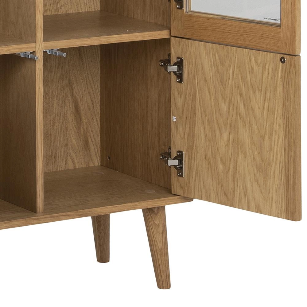 Regał składa się z dwóch części: górnej (szklanej) i dolnej (drewnianej). Oszklona witryna pozwala na łatwą organizację cennych drobiazgów i chroni je przed kurzem, a drewniana ukryje to, co w danym momencie nie potrzebuje być wyeksponowane. Nagano pomieści ulubione albumy, tomiki wierszy, zastawę stołową… Wszystko, co warto mieć pod ręką.