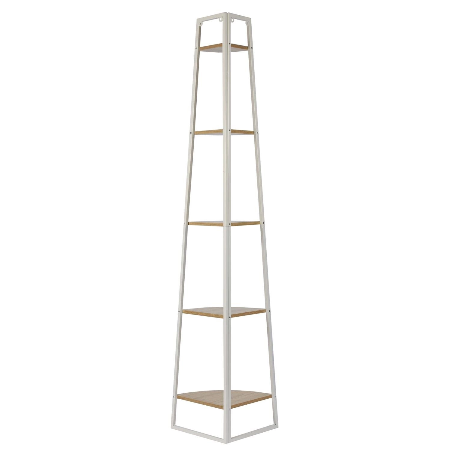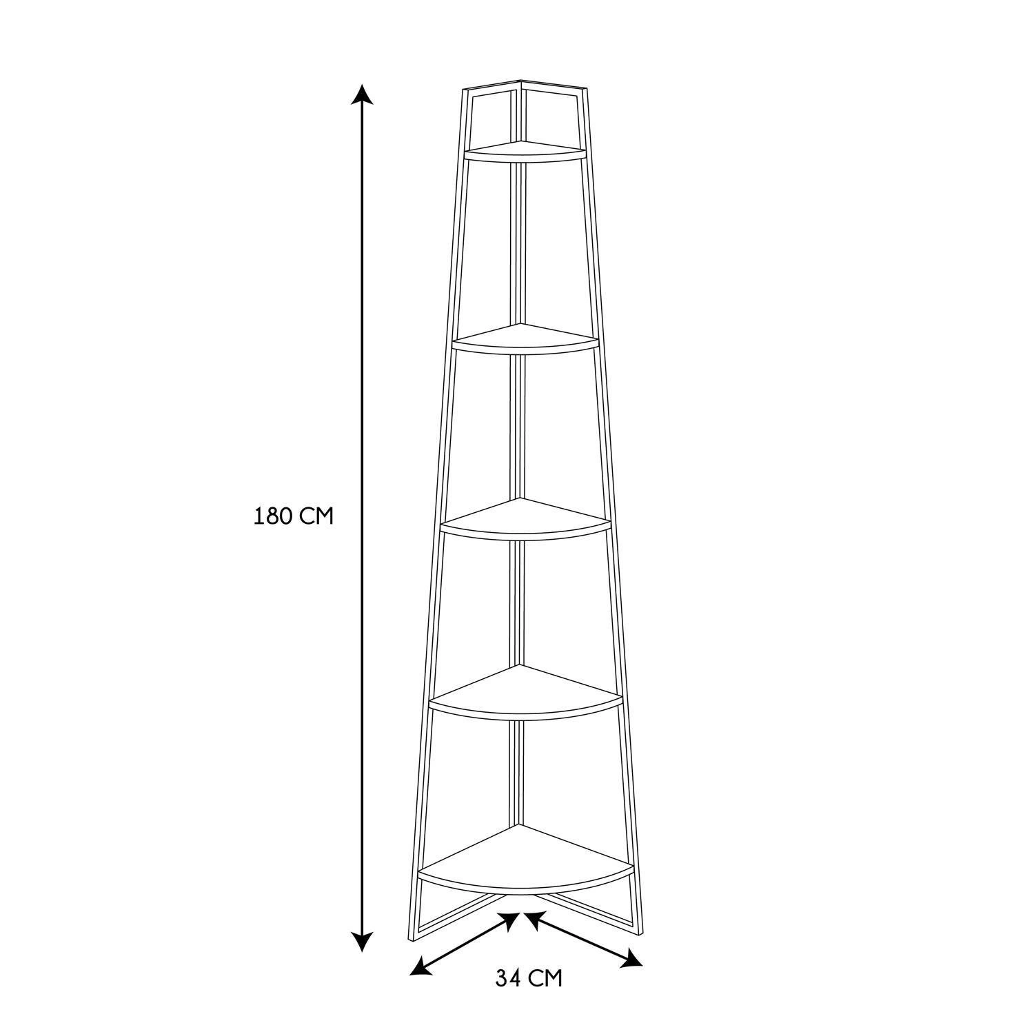 Regał Corner narożny z 5 półkami biały Wąski, narożny regał z półkami Corner, to mebel do niewielkiego wnętrza, w którym liczy się każdy centymetr. Blat zwężający się ku górze jest wykonany z płyty MDF i wzmocniony metalowymi poprzeczkami, tworząc trwały i stylowy element, który doda do Twojego nowoczesnego wystroju loftu. Regał Corner został zaprojektowany z myślą o osobach kreatywnych i odważnych. To nie jest zwykły regał... to wyrazisty mebel. Z półkami o kształcie ćwierć koła, zwęża się ku górze. Pięć półek pomieści sporo przedmiotów lub dokumentów. Narożny mebel w loftowym stylu wykonany został z metalowej bazy pomalowanej proszkowo na biało oraz półek z płyty MDF oklejonych laminatem imitującym drewno. Maks obciążenie 3kg na półkę. Dla tych, którzy nie lubią wtapiać się w otoczenie, Corner jest idealnym regałem. Jest odważny i swobodny - to coś, czego nie można znaleźć wszędzie. Upewnij się, że to dobry wybór! Wąski regał, znajdzie miejsce nawet w najmniejszym salonie Nowoczesny i stylowy wygląd Wytrzymała konstrukcja - wzmocniona metalowymi poprzeczkami Wystarczająco dużo miejsca do przechowywania książek, akcesoriów i dekoracji