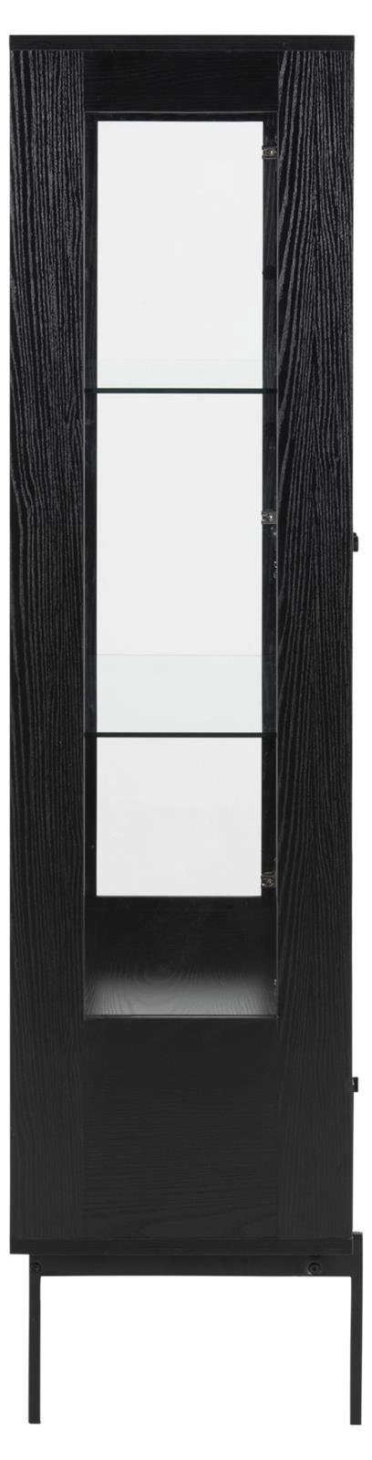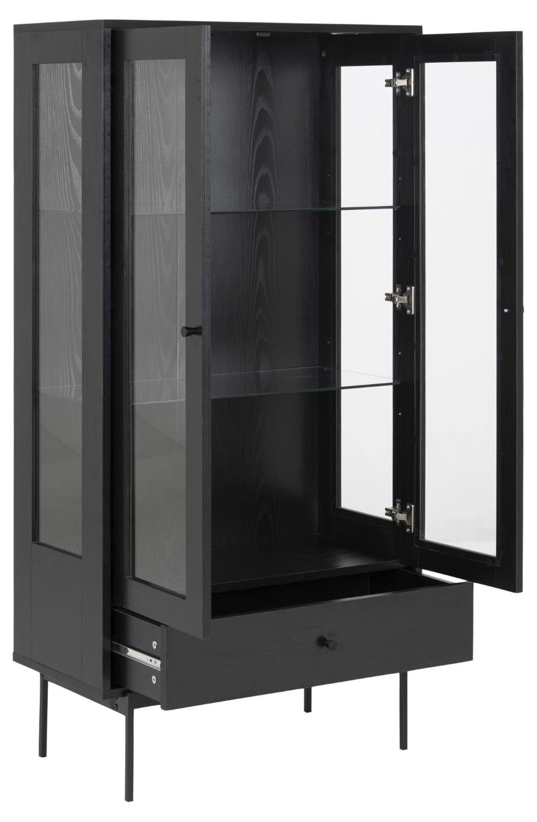 Czarna niska witryna na książki ANGUS to klasyczny mebel, który wykorzystasz do ekspozycji zastawy stołowej w jadalni, a także jako miejsce do przechowywania książek, pamiątek czy porcelany w salonie. Jest to subtelny i zgrabny mebel, którego korpus powstał z płyty MDF wykończonej laminatem imitującym jesion. We wnętrzu tej witryny na książki mieszczą się dwie półki ze szkła o maksymalnym obciążeniu 9 kg każda, które będą ciekawym miejscem na skarby. Ogromnym atutem są przeszklenia zarówno na drzwiczkach frontowych, jak i ściankach bocznych, które posiada ten regał typu witryna na książki. Dodatkowo pod szafką umieszczona została szuflada, która może być miejscem na przedmioty, których nie chcemy pokazywać, np. złożone obrusy lub sztućce. Jeśli chcesz stworzyć jednolitą przestrzeń wykorzystaj też inne meble z kolekcji Angus!