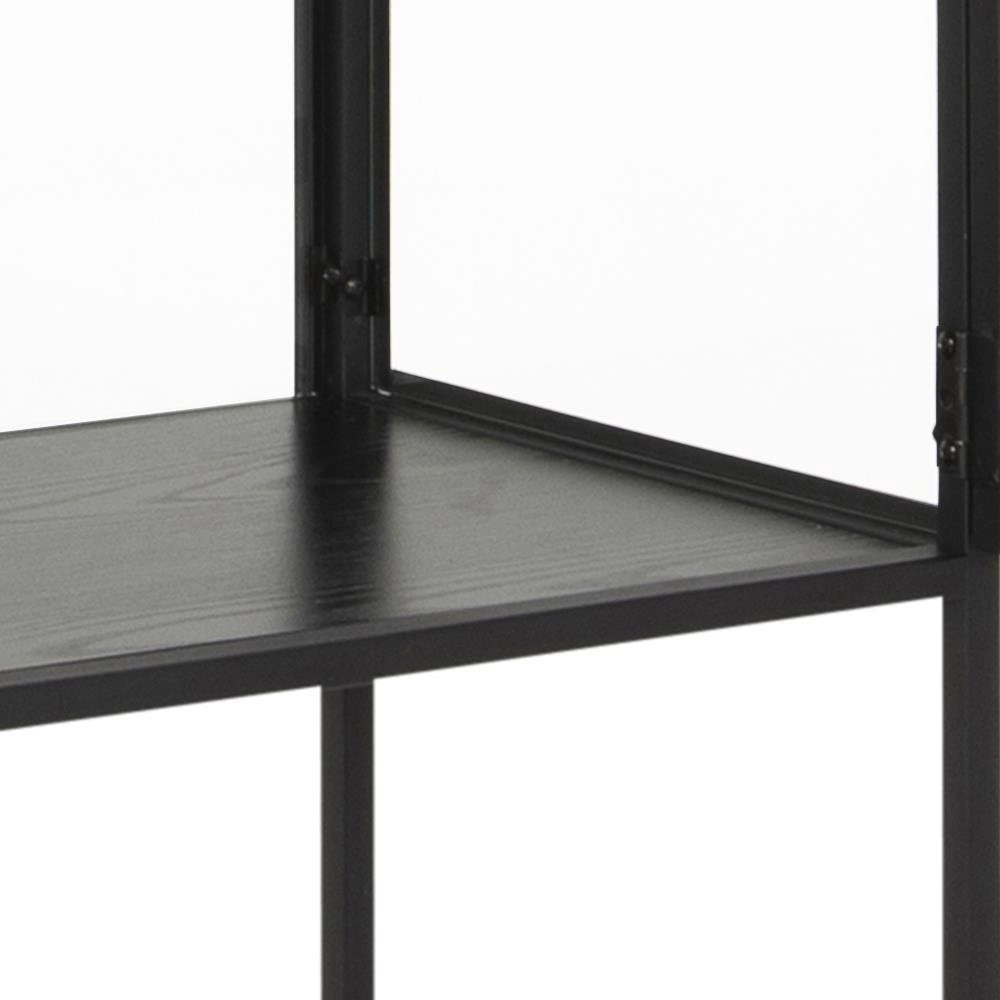 Nowoczesna witryna na książki Seaford została wykonana z połączenia malowanego proszkowo metalu i przezroczystego szkła. Zestawienie ze sobą tych dwóch elementów nadaje meblu niezwykłej elegancji. Wszystkie jej ściany jak i drzwiczki wykonane są ze szkła, dzięki czemu witryna nabiera wizualnej lekkości. Szyby osadzone są w metalowych obramowaniach. Mebel wyposażony został w cztery, smukłe nogi z dodatkowymi wspornikami. Górny blat tej witryny na książki do salonu oraz cztery bardzo szerokie półki to płyty MDF w okleinie w kolorze dębu. W witrynie pięknie zaprezentują się różnorodne kolekcje czy zastawy. Witryna na książki zamykana Seaford idealnie sprawdzi się w jadalni, salonie lub eleganckiej restauracji.