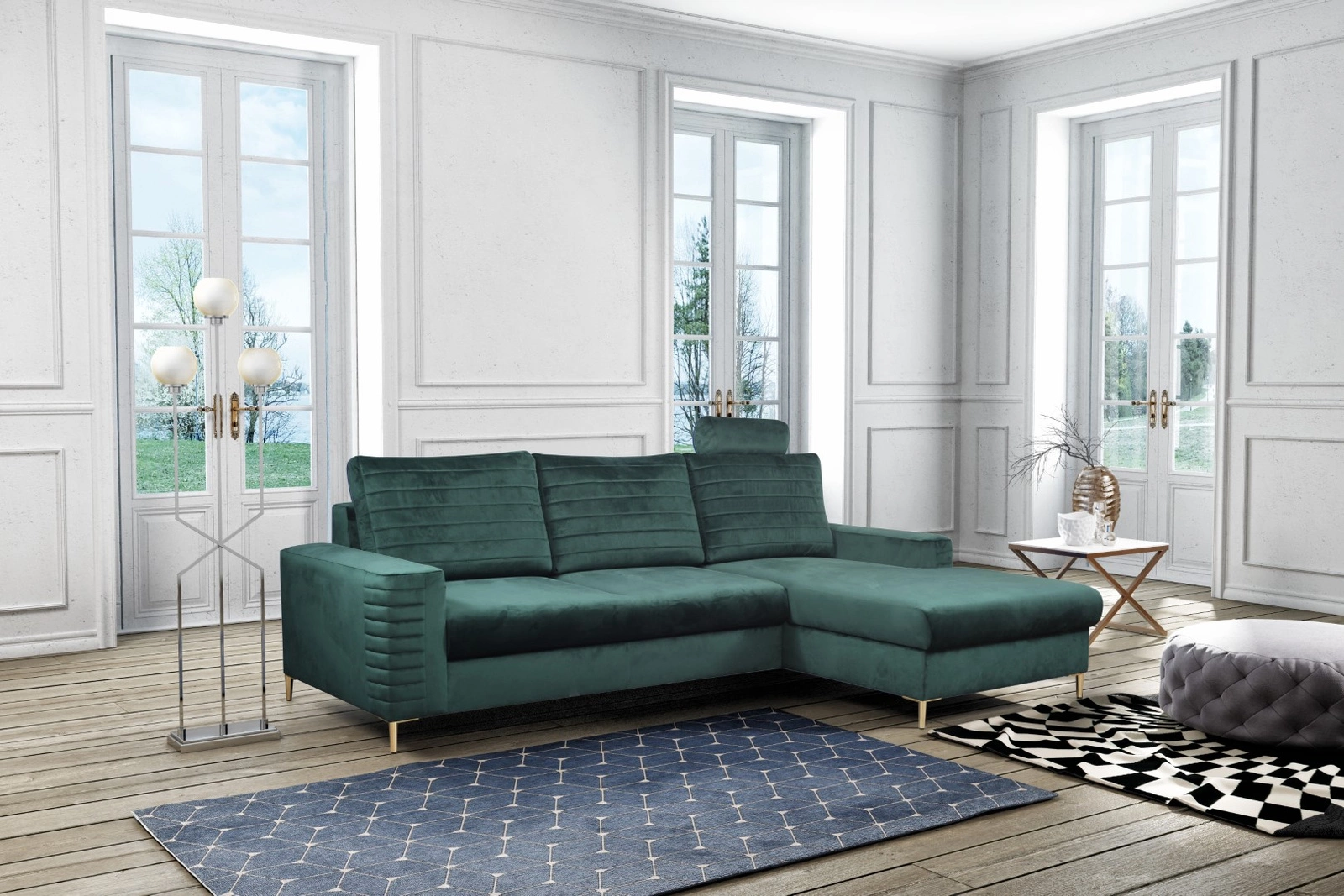 Narożnik Hald przyciąga wzrok swoim nowoczesnym designem. Butelkowa zieleń tkaniny Velluto dodaje mu elegancji, a złota podstawa wykonana z metalu gwarantuje stabilność i trwałość. To mebel, który doskonale wpasuje się w różne style wnętrz - od nowoczesnych, przez klasyczne, aż po skandynawskie czy loftowe.