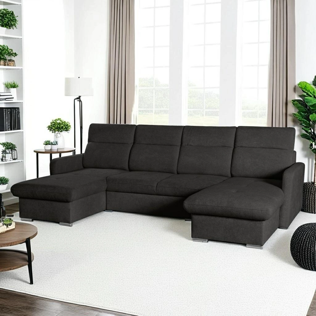 - Uniwersalny kształt U – idealny do większych salonów, tworzy przytulną strefę wypoczynkową.