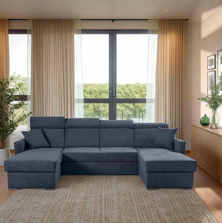 - Rozkładany narożnik w kształcie litery U – idealny do dużych salonów i przestrzeni otwartych
