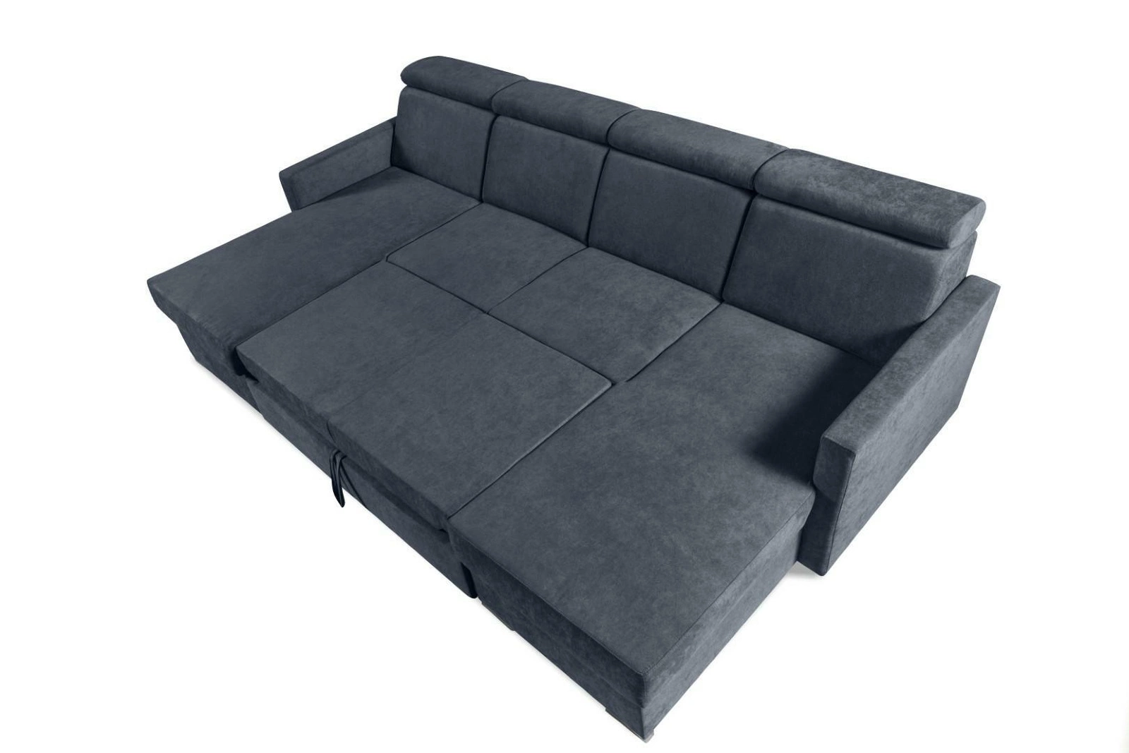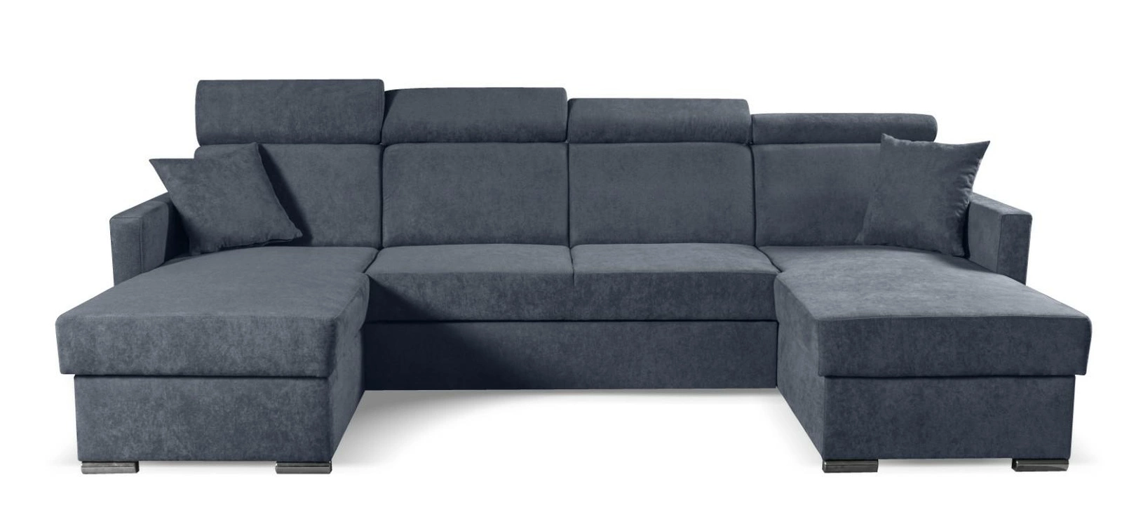 Narożnik Mils U marki Intesi to nowoczesny, rozkładany narożnik z funkcją spania, wykonany z aksamitnej tkaniny w eleganckim granatowo-szarym odcieniu. Oferuje dużą powierzchnię spania 120×250 cm, praktyczny pojemnik na pościel oraz dwustronny układ w kształcie litery U, dzięki czemu z łatwością dopasuje się do każdego salonu. Solidne wypełnienie pianką tapicerską i sprężynami falistymi gwarantuje komfort zarówno podczas wypoczynku, jak i codziennego snu.